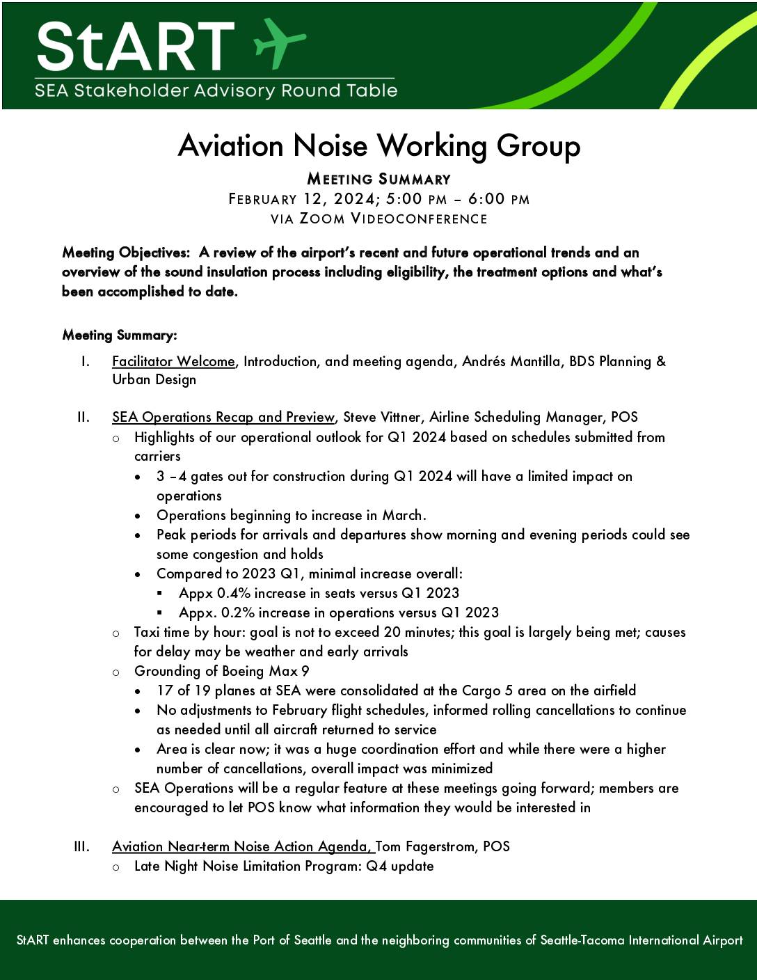 StART enhances cooperation between the Port of Seattle and the neighboring communities of Seattle-Tacoma International Airport Aviation Noise Working Group MMEEEETTIINNGG SSUUMMMMAARRYY FEBRUARY 12, 2024; 5:00 PM – 6:00 PM VIA ZOOM V IDEOCONFERENCE MMeeeettiinngg OObbjjeeccttiivveess:: AA rreevviieeww ooff tthhee aaiirrppoorrtt’’ss rreecceenntt aanndd ffuuttuurree ooppeerraattiioonnaall ttrreennddss aanndd aann oovveerrvviieeww ooff tthhee ssoouunndd iinnssuullaattiioonn pprroocceessss iinncclluuddiinngg eelliiggiibbiilliittyy,, tthhee ttrreeaattmmeenntt ooppttiioonnss aanndd wwhhaatt’’ss bbeeeenn aaccccoommpplliisshheedd ttoo ddaattee.. MMeeeettiinngg SSuummmmaarryy:: I. Facilitator Welcome, Introduction, and meeting agenda, Andrés Mantilla, BDS Planning & Urban Design II. SEA Operations Recap and Preview, Steve Vittner, Airline Scheduling Manager, POS o Highlights of our operational outlook for Q1 2024 based on schedules submitted from carriers • 3 –4 gates out for construction during Q1 2024 will have a limited impact on operations • Operations beginning to increase in March. • Peak periods for arrivals and departures show morning and evening periods could see some congestion and holds • Compared to 2023 Q1, minimal increase overall: § Appx 0.4% increase in seats versus Q1 2023 § Appx. 0.2% increase in operations versus Q1 2023 o Taxi time by hour: goal is not to exceed 20 minutes; this goal is largely being met; causes for delay may be weather and early arrivals o Grounding of Boeing Max 9 • 17 of 19 planes at SEA were consolidated at the Cargo 5 area on the airfield • No adjustments to February flight schedules, informed rolling cancellations to continue as needed until all aircraft returned to service • Area is clear… -