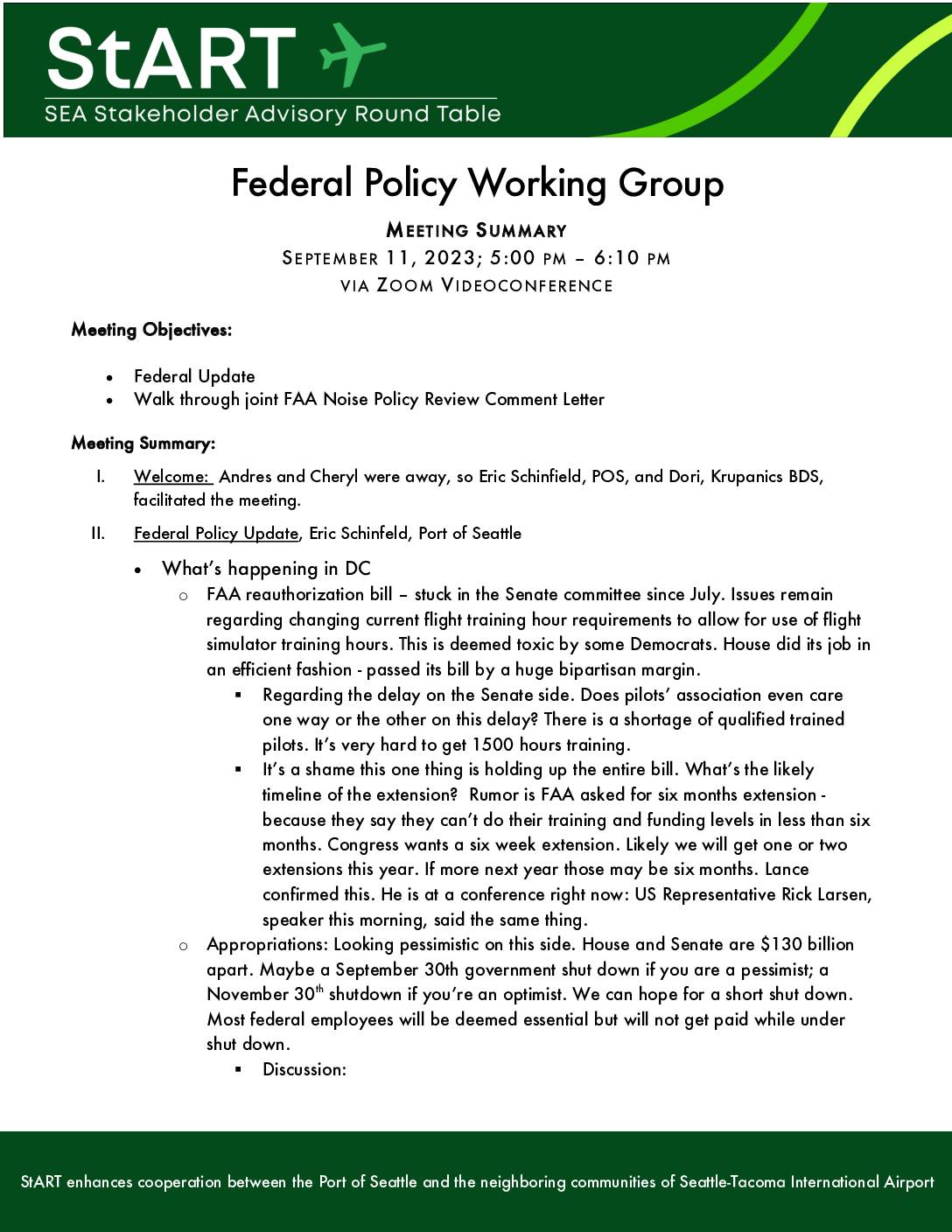StART enhances cooperation between the Port of Seattle and the neighboring communities of Seattle-Tacoma International Airport Federal Policy Working Group MMEEEETTIINNGG SSUUMMMMAARRYY SEPTEMBER 11, 2023; 5:00 PM – 6:10 PM VIA ZOOM V IDEOCONFERENCE MMeeeettiinngg OObbjjeeccttiivveess:: • Federal Update • Walk through joint FAA Noise Policy Review Comment Letter MMeeeettiinngg SSuummmmaarryy:: I. Welcome: Andres and Cheryl were away, so Eric Schinfield, POS, and Dori, Krupanics BDS, facilitated the meeting. II. Federal Policy Update, Eric Schinfeld, Port of Seattle • What’s happening in DC o FAA reauthorization bill – stuck in the Senate committee since July. Issues remain regarding changing current flight training hour requirements to allow for use of flight simulator training hours. This is deemed toxic by some Democrats. House did its job in an efficient fashion - passed its bill by a huge bipartisan margin. § Regarding the delay on the Senate side. Does pilots’ association even care one way or the other on this delay? There is a shortage of qualified trained pilots. It’s very hard to get 1500 hours training. § It’s a shame this one thing is holding up the entire bill. What’s the likely timeline of the extension? Rumor is FAA asked for six months extension - because they say they can’t do their training and funding levels in less than six months. Congress wants a six week extension. Likely we will get one or two extensions this year. If more next year those may be six months. Lance confirmed this. He is at… -