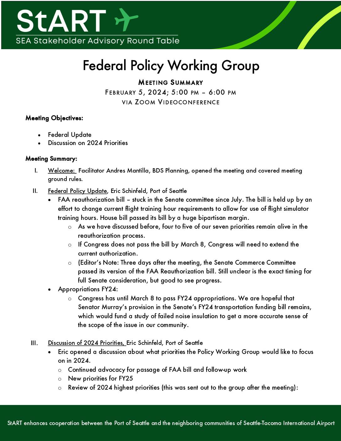 StART enhances cooperation between the Port of Seattle and the neighboring communities of Seattle-Tacoma International Airport Federal Policy Working Group MMEEEETTIINNGG SSUUMMMMAARRYY FEBRUARY 5, 2024; 5:00 PM – 6:00 PM VIA ZOOM V IDEOCONFERENCE MMeeeettiinngg OObbjjeeccttiivveess:: • Federal Update • Discussion on 2024 Priorities MMeeeettiinngg SSuummmmaarryy:: I. Welcome: Facilitator Andres Mantilla, BDS Planning, opened the meeting and covered meeting ground rules. II. Federal Policy Update, Eric Schinfeld, Port of Seattle • FAA reauthorization bill – stuck in the Senate committee since July. The bill is held up by an effort to change current flight training hour requirements to allow for use of flight simulator training hours. House bill passed its bill by a huge bipartisan margin. o As we have discussed before, four to five of our seven priorities remain alive in the reauthorization process. o If Congress does not pass the bill by March 8, Congress will need to extend the current authorization. o (Editor’s Note: Three days after the meeting, the Senate Commerce Committee passed its version of the FAA Reauthorization bill. Still unclear is the exact timing for full Senate consideration, but good to see progress. • Appropriations FY24: o Congress has until March 8 to pass FY24 appropriations. We are hopeful that Senator Murray’s provision in the Senate’s FY24 transportation funding bill remains, which would fund a study of failed noise insulation to get a more accurate sense of the scope of the issue in our community. III. Discussion of 2024 Priorities, Eric Schinfeld, Port of… -
