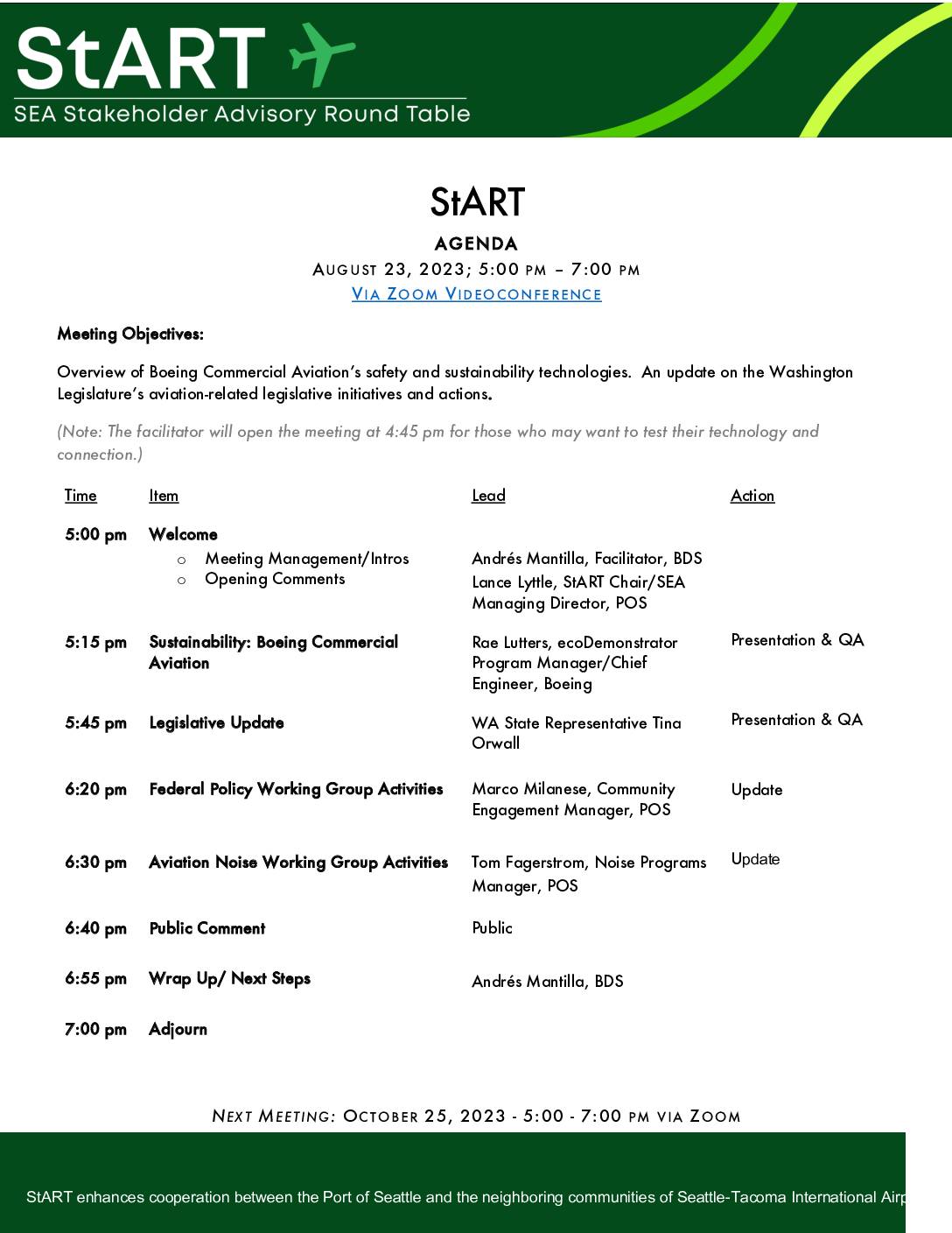 StART enhances cooperation between the Port of Seattle and the neighboring communities of Seattle-Tacoma International Airport StART AAGGEENNDDAA AUGUST 23, 2023; 5:00 PM – 7:00 PM V IA ZOOM V IDEOCONFERENCE MMeeeettiinngg OObbjjeeccttiivveess:: Overview of Boeing Commercial Aviation’s safety and sustainability technologies. An update on the Washington Legislature’s aviation-related legislative initiatives and actions.. (Note: The facilitator will open the meeting at 4:45 pm for those who may want to test their technology and connection.) Time Item Lead Action 55::0000 ppmm WWeellccoommee o Meeting Management/Intros o Opening Comments Andrés Mantilla, Facilitator, BDS Lance Lyttle, StART Chair/SEA Managing Director, POS 55::1155 ppmm SSuussttaaiinnaabbiilliittyy:: BBooeeiinngg CCoommmmeerrcciiaall AAvviiaattiioonn Rae Lutters, ecoDemonstrator Program Manager/Chief Engineer, Boeing Presentation & QA 55::4455 ppmm LLeeggiissllaattiivvee UUppddaattee WA State Representative Tina Orwall Presentation & QA 66::2200 ppmm -