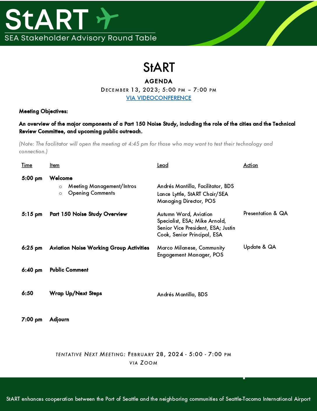 StART enhances cooperation between the Port of Seattle and the neighboring communities of Seattle-Tacoma International Airport StART AAGGEENNDDAA DECEMBER 13, 2023; 5:00 PM – 7:00 PM VIA VIDEOCONFERENCE MMeeeettiinngg OObbjjeeccttiivveess:: AAnn oovveerrvviieeww ooff tthhee mmaajjoorr ccoommppoonneennttss ooff aa PPaarrtt 115500 NNooiissee SSttuuddyy,, iinncclluuddiinngg tthhee rroollee ooff tthhee cciittiieess aanndd tthhee TTeecchhnniiccaall RReevviieeww CCoommmmiitttteeee,, aanndd uuppccoommiinngg ppuubblliicc oouuttrreeaacchh.. (Note: The facilitator will open the meeting at 4:45 pm for those who may want to test their technology and connection.) Time Item Lead Action 55::0000 ppmm WWeellccoommee o Meeting Management/Intros o Opening Comments Andrés Mantilla, Facilitator, BDS Lance Lyttle, StART Chair/SEA Managing Director, POS 55::1155 ppmm PPaarrtt 115500 NNooiissee SSttuuddyy OOvveerrvviieeww Autumn Ward, Aviation Specialist, ESA; Mike Arnold, Senior Vice President, ESA; Justin Cook, Senior Principal, ESA Presentation & QA 66::2255 ppmm AAvviiaattiioonn NNooiissee WWoorrkkiinngg GGrroouupp AAccttiivviittiieess Marco Milanese, Community Engagement Manager, POS Update & QA 66::4400 ppmm -