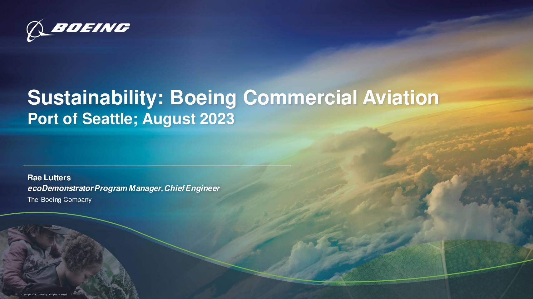 Copyright © 2022 Boeing. All rights reserved. Sustainability: Boeing Commercial Aviation Port of Seattle; August 2023 Rae Lutters ecoDemonstrator Program Manager, Chief Engineer The Boeing Company Copyright © 2022 Boeing. All rights reserved. 2 BOEING’S SUSTAINABILITY GOALS S U S T A I N A B L E A E R O S P A C E T O G E T H E R EMPLOYEE SAFETY & WELL-BEING GLOBAL AEROSPACE SAFETY EQUITY, DIVERSITY & INCLUSION SUSTAINABLE OPERATIONS INNOVATION & CLEAN TECHNOLOGY COMMUNITY ENGAGEMENT Copyright © 2022 Boeing. All rights reserved. | BCA-PD | 12SEP2022 Aviation contributes 2.6% of total global emissions Source: 2018, World Resources Institute Copyright © 2022 Boeing. All rights reserved. 4 OUR STRATEGY TO DECARBONIZE AVIATION Fleet renewal Renewable energy Advanced technology Operational efficiency Copyright © 2022 Boeing. All rights reserved. 5 FLEET RENEWAL - INNOVATION & PERFORMANCE ✓ ✓ Copyright © 2022 Boeing. All rights reserved. 6 Zero-impact: ZERO CLIMATE IMPACT Total climate effects Zero-impact: Total lifecycle emissions Indirect Direct CO2CH4 NOXH2O Aviation-induced cloudiness On-ground Inflight Full lifecycle accounting Extraction Logistics Production Distribution Storage Copyright © 2022 Boeing. All rights reserved. 7 SUSTAINABILITY TOGETHER Apri l 2021 IQ Magazine https://www.boeing.com/features/innovation-quarterly/2021/04/boeing-product-sustainability.page Copyright © 2022 Boeing. All rights reserved. 8 BOEING ECODEMONSTRATOR PROGRAM Innovate Learn by doing, discover quickly Collaborate With airlines, government, suppliers, academia, industry Accelerate Speed path to products, services and production An Enduring Mission Copyright © 2022 Boeing. All rights reserved. 9 Accelerating Innovation 250+ technologies tested with focus in: Sustainable Aviation Fuel Operational… -