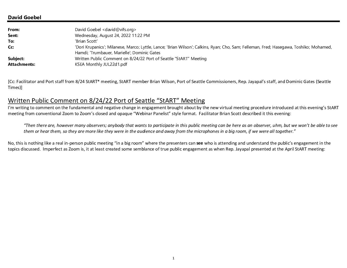 Sent: Wednesday, August 24, 2022 11:22 PM To: 'Brian Scott' Cc: 'Dori Krupanics'; Milanese, Marco; Lyttle, Lance; 'Brian Wilson'; Calkins, Ryan; Cho, Sam; Felleman, Fred; Hasegawa, Toshiko; Mohamed, Hamdi; 'Trumbauer, Marielle'; Dominic Gates Subject: Written Public Comment on 8/24/22 Port of Seattle “StART” Meeting Attachments: KSEA Monthly JUL22d1.pdf [Cc: Facilitator and Port staff from 8/24 StART* meeting, StART member Brian Wilson, Port of Seattle Commissioners, Rep. Jayapal’s staff, and Dominic Gates (Seattle Times)] Written Public Comment on 8/24/22 Port of Seattle “StART” Meeting I’m writing to comment on the fundamental and negative change in engagement brought about by the new virtual meeting procedure introduced at this evening’s StART meeting from conventional Zoom to Zoom’s closed and opaque “Webinar Panelist” style format. Facilitator Brian Scott described it this evening: “Then there are, however many observers; anybody that wants to participate in this public meeting can be here as an observer, uhm, but we won’t be able to see them or hear them, so they are more like they were in the audience and away from the microphones in a big room, if we were all together.” No, this is nothing like a real in-person public meeting “in a big room” where the presenters can see who is attending and understand the public’s engagement in the topics discussed. Imperfect as Zoom is, it at least created some semblance of true public engagement as when Rep. Jayapal presented at the April StART meeting: Now the official StART members are safely insulated from the… -