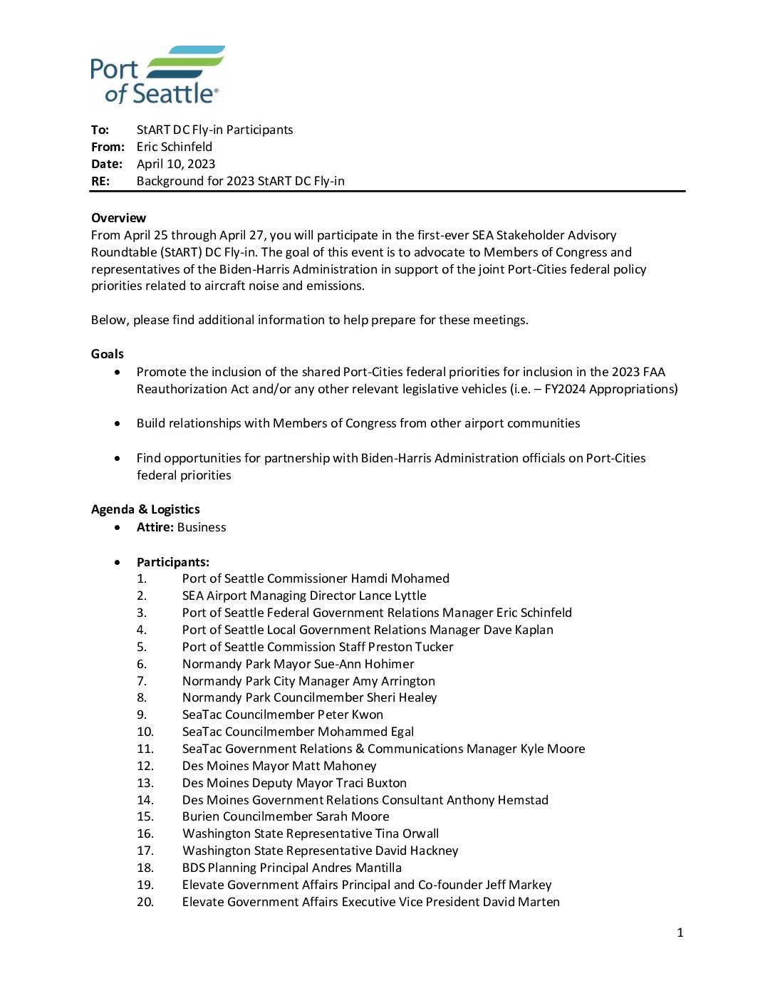 RE: Background for 2023 StART DC Fly-in Overview From April 25 through April 27, you will participate in the first-ever SEA Stakeholder Advisory Roundtable (StART) DC Fly-in. The goal of this event is to advocate to Members of Congress and representatives of the Biden-Harris Administration in support of the joint Port-Cities federal policy priorities related to aircraft noise and emissions. Below, please find additional information to help prepare for these meetings. Goals • Promote the inclusion of the shared Port-Cities federal priorities for inclusion in the 2023 FAA Reauthorization Act and/or any other relevant legislative vehicles (i.e. – FY2024 Appropriations) • Build relationships with Members of Congress from other airport communities • Find opportunities for partnership with Biden-Harris Administration officials on Port-Cities federal priorities Agenda & Logistics • Attire: Business • Participants: 1. Port of Seattle Commissioner Hamdi Mohamed 2. SEA Airport Managing Director Lance Lyttle 3. Port of Seattle Federal Government Relations Manager Eric Schinfeld 4. Port of Seattle Local Government Relations Manager Dave Kaplan 5. Port of Seattle Commission Staff Preston Tucker 6. Normandy Park Mayor Sue-Ann Hohimer 7. Normandy Park City Manager Amy Arrington 8. Normandy Park Councilmember Sheri Healey 9. SeaTac Councilmember Peter Kwon 10. SeaTac Councilmember Mohammed Egal 11. SeaTac Government Relations & Communications Manager Kyle Moore 12. Des Moines Mayor Matt Mahoney 13. Des Moines Deputy Mayor Traci Buxton 14. Des Moines Government Relations Consultant Anthony Hemstad 15. Burien Councilmember Sarah Moore 16. Washington State Representative Tina Orwall 17. Washington State Representative David Hackney… -