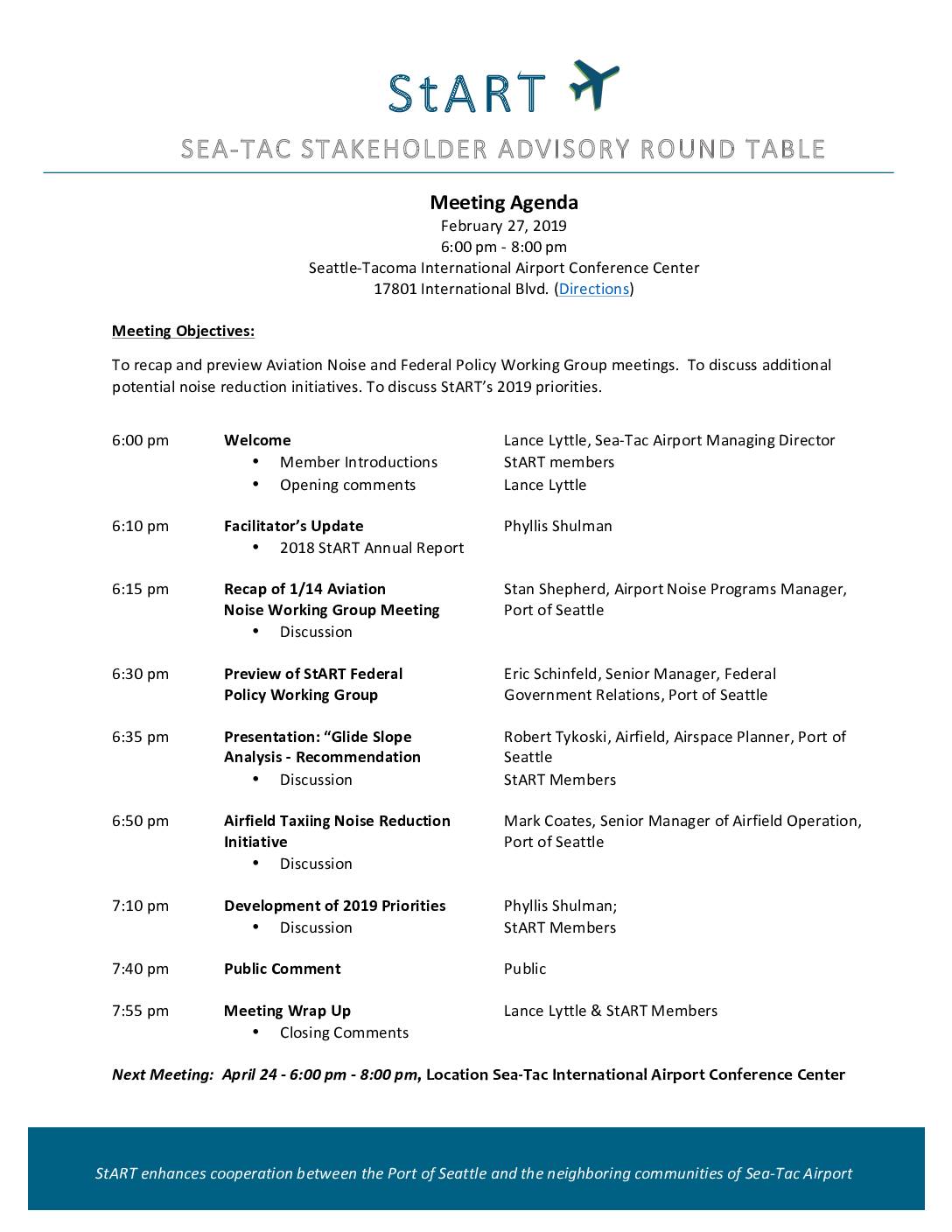 StART enhances cooperation between the Port of Seattle and the neighboring communities of Sea-Tac Airport Meeting Agenda February 27, 2019 6:00 pm - 8:00 pm Seattle-Tacoma International Airport Conference Center 17801 International Blvd. (Directions) Meeting Objectives: To recap and preview Aviation Noise and Federal Policy Working Group meetings. To discuss additional potential noise reduction initiatives. To discuss StART’s 2019 priorities. 6:00 pm Welcome Lance Lyttle, Sea-Tac Airport Managing Director • Member Introductions StART members • Opening comments Lance Lyttle 6:10 pm Facilitator’s Update Phyllis Shulman • 2018 StART Annual Report 6:15 pm Recap of 1/14 Aviation Stan Shepherd, Airport Noise Programs Manager, Noise Working Group Meeting Port of Seattle • Discussion 6:30 pm Preview of StART Federal Eric Schinfeld, Senior Manager, Federal Policy Working Group Government Relations, Port of Seattle 6:35 pm Presentation: “Glide Slope Robert Tykoski, Airfield, Airspace Planner, Port of Analysis - Recommendation Seattle • Discussion StART Members 6:50 pm Airfield Taxiing Noise Reduction Mark Coates, Senior Manager of Airfield Operation, Initiative Port of Seattle • Discussion 7:10 pm Development of 2019 Priorities Phyllis Shulman; • Discussion StART Members 7:40 pm Public Comment Public 7:55 pm Meeting Wrap Up Lance Lyttle & StART Members • Closing Comments Next Meeting: April 24 - 6:00 pm - 8:00 pm, Location Sea-Tac International Airport Conference Center -
