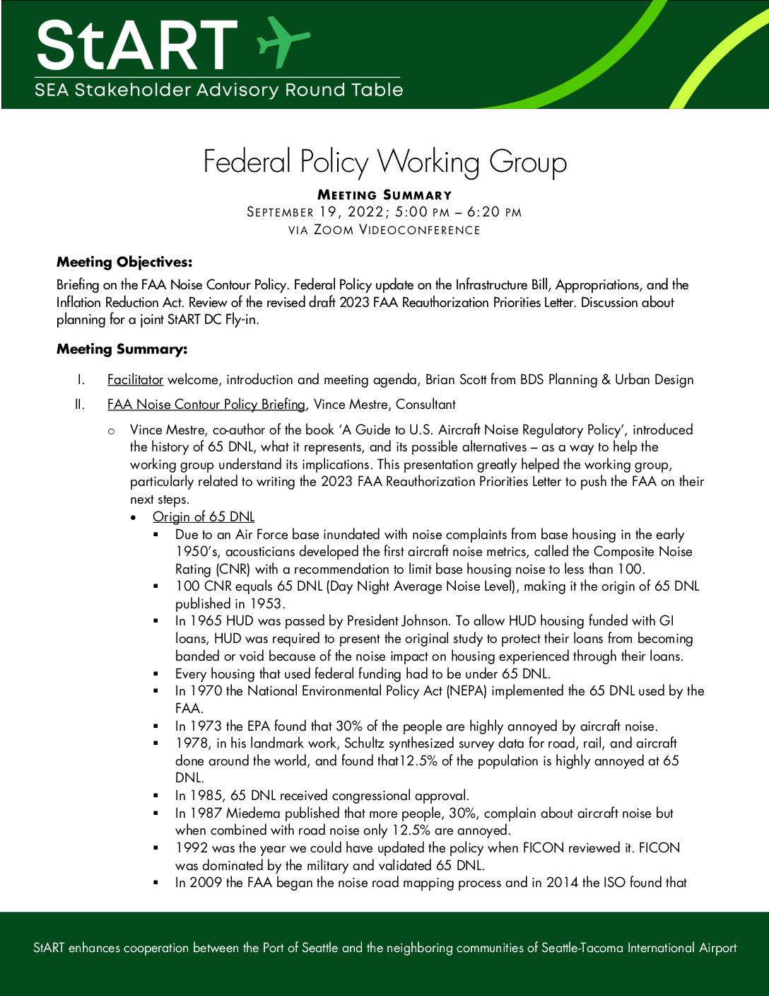 StART enhances cooperation between the Port of Seattle and the neighboring communities of Seattle-Tacoma International Airport Federal Policy Working Group MEETING SUMMARY SEPTEMBER 19, 2022; 5:00 PM – 6:20 PM VIA ZOOM V IDEOCONFERENCE Meeting Objectives: Briefing on the FAA Noise Contour Policy. Federal Policy update on the Infrastructure Bill, Appropriations, and the Inflation Reduction Act. Review of the revised draft 2023 FAA Reauthorization Priorities Letter. Discussion about planning for a joint StART DC Fly-in. Meeting Summary: I. Facilitator welcome, introduction and meeting agenda, Brian Scott from BDS Planning & Urban Design II. FAA Noise Contour Policy Briefing, Vince Mestre, Consultant o Vince Mestre, co-author of the book ‘A Guide to U.S. Aircraft Noise Regulatory Policy’, introduced the history of 65 DNL, what it represents, and its possible alternatives – as a way to help the working group understand its implications. This presentation greatly helped the working group, particularly related to writing the 2023 FAA Reauthorization Priorities Letter to push the FAA on their next steps. • Origin of 65 DNL § Due to an Air Force base inundated with noise complaints from base housing in the early 1950’s, acousticians developed the first aircraft noise metrics, called the Composite Noise Rating (CNR) with a recommendation to limit base housing noise to less than 100. § 100 CNR equals 65 DNL (Day Night Average Noise Level), making it the origin of 65 DNL published in 1953. § In 1965 HUD was passed by President Johnson. To allow HUD housing funded with… -