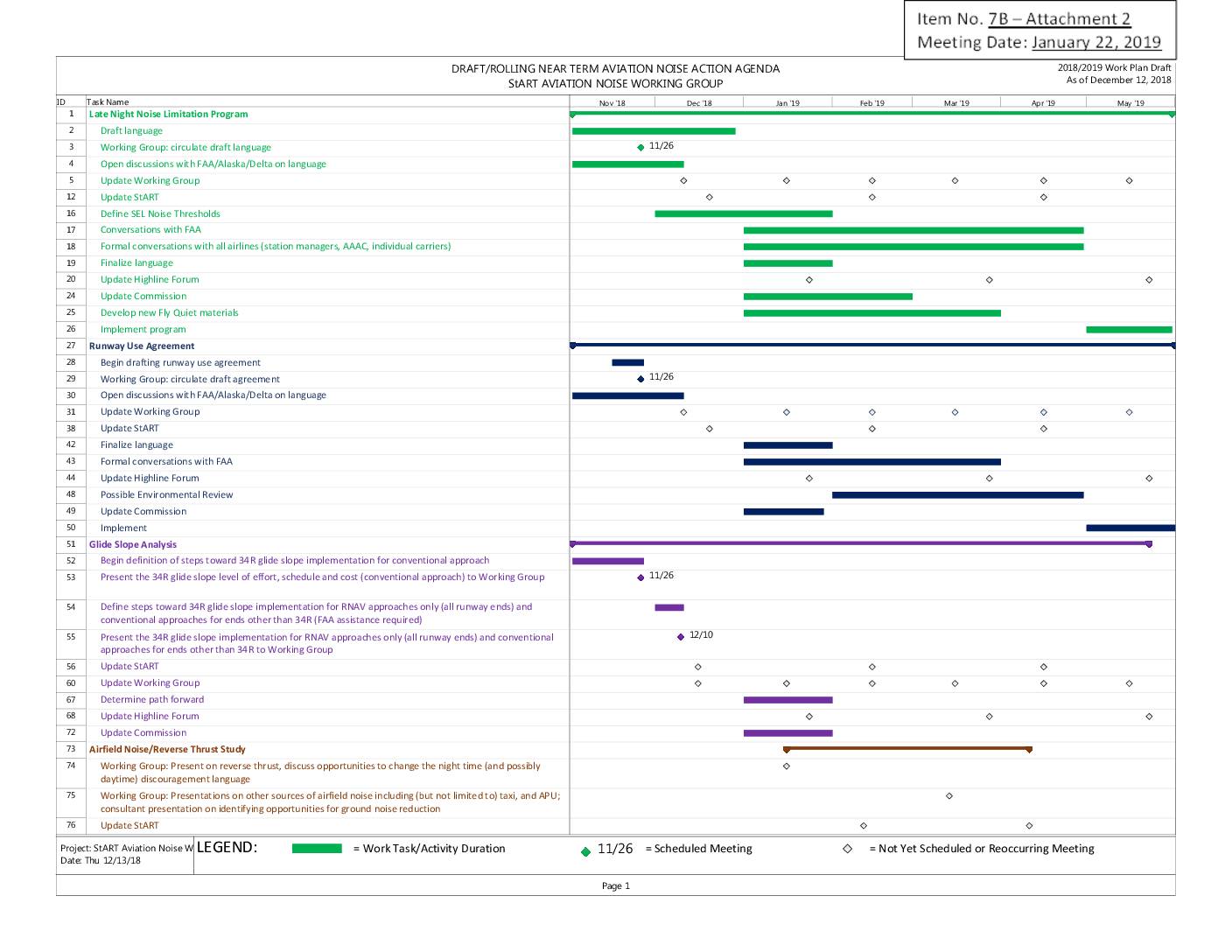 Formal conversations with all airlines (station managers, AAAC, individual carriers) Finalize language Update Highline Forum Update Commission Develop new Fly Quiet materials Implement program Runway Use Agreement Begin drafting runway use agreement Working Group: circulate draft agreement Open discussions with FAA/Alaska/Delta on language Update Working Group Update StART Finalize language Formal conversations with FAA Update Highline Forum Possible Environmental Review Update Commission Implement Glide Slope Analysis Begin definition of steps toward 34R glide slope implementation for conventional approach Present the 34R glide slope level of effort, schedule and cost (conventional approach) to Working Group Define steps toward 34R glide slope implementation for RNAV approaches only (all runway ends) and conventional approaches for ends other than 34R (FAA assistance required) Present the 34R glide slope implementation for RNAV approaches only (all runway ends) and conventional approaches for ends other than 34R to Working Group Update StART Update Working Group Determine path forward Update Highline Forum Update Commission Airfield Noise/Reverse Thrust Study Working Group: Present on reverse thrust, discuss opportunities to change the night time (and possibly daytime) discouragement language Working Group: Presentations on other sources of airfield noise including (but not limited to) taxi, and APU; consultant presentation on identifying opportunities for ground noise reduction Update StART 11/26 11/26 11/26 12/10 Nov '18 Dec '18 Jan '19 Feb '19 Mar '19 Apr '19 May '19 DRAFT/ROLLING NEAR TERM AVIATION NOISE ACTION AGENDA StART AVIATION NOISE WORKING GROUP 2018/2019 Work Plan Draft As of December 12, 2018 Page 1 Project: StART Aviation… -