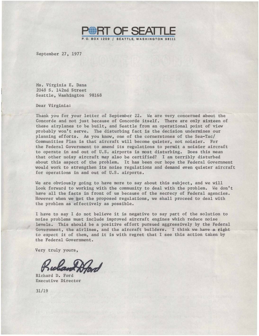 Letter from Port of Seattle Executive Director Richard D. Ford regarding Concorde aircraft noise concerns