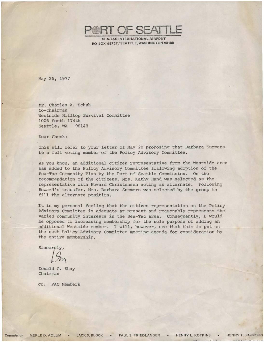Letter from Donald G. Shay to Charles Schuh regarding a proposal for Barbara Summers to become a full voting member of the Policy Advisory Committee. Shay explains the current citizen representation structure and expresses opposition to increasing membership solely for an additional Westside member. -
