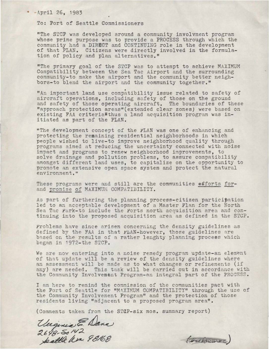 A letter to Port of Seattle Commissioners emphasizing the community’s commitment to maximum compatibility between Sea-Tac Airport and surrounding neighborhoods through the Sea-Tac Communities Plan (STCP) and its Community Involvement Program. The author reminds commissioners of the community’s pact for direct citizen participation in planning processes. -