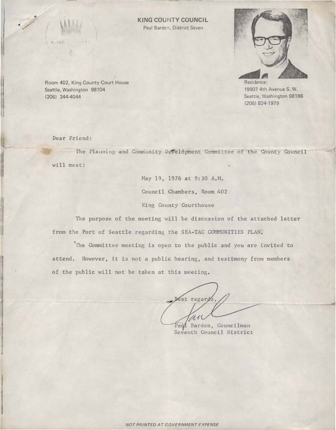 Notice from King County Councilman Paul Barden announcing a Planning and Community Committee meeting to discuss a letter from the Port of Seattle regarding the SEA-TAC COMMUNITIES PLAN. The meeting is open to the public but not a public hearing. -