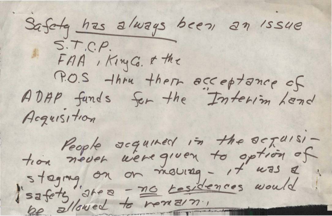 Handwritten notes by Virginia Dana discussing safety issues related to various organizations including S.T.C.P., FAA, KingCo, and P.O.S. References acceptance of ADHP funds for interim land acquisition and mentions that people acquired in the acquisition were never given option of staying or moving. -