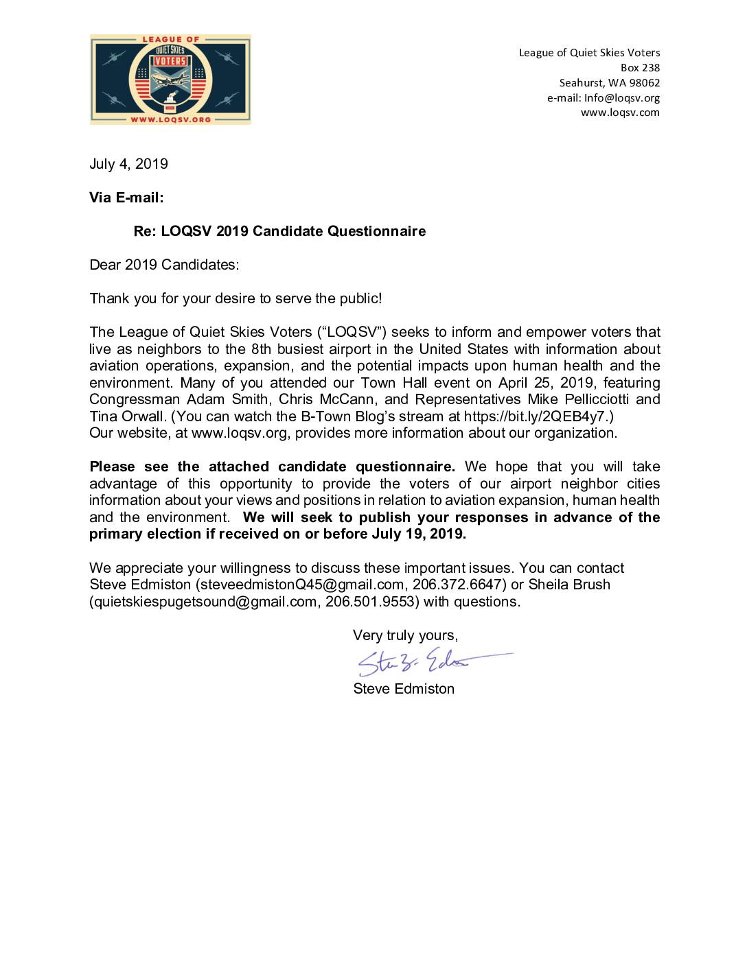 Thank you for your desire to serve the public! The League of Quiet Skies Voters (“LOQSV”) seeks to inform and empower voters that live as neighbors to the 8th busiest airport in the United States with information about aviation operations, expansion, and the potential impacts upon human health and the environment. Many of you attended our Town Hall event on April 25, 2019, featuring Congressman Adam Smith, Chris McCann, and Representatives Mike Pellicciotti and Tina Orwall. (You can watch the B-Town Blog’s stream at https://bit.ly/2QEB4y7.) Our website, at www.loqsv.org, provides more information about our organization. Please see the attached candidate questionnaire. We hope that you will take advantage of this opportunity to provide the voters of our airport neighbor cities information about your views and positions in relation to aviation expansion, human health and the environment. We will seek to publish your responses in advance of the primary election if received on or before July 19, 2019. We appreciate your willingness to discuss these important issues. You can contact Steve Edmiston (steveedmistonQ45@gmail.com, 206.372.6647) or Sheila Brush (quietskiespugetsound@gmail.com, 206.501.9553) with questions. Very truly yours, Steve Edmiston