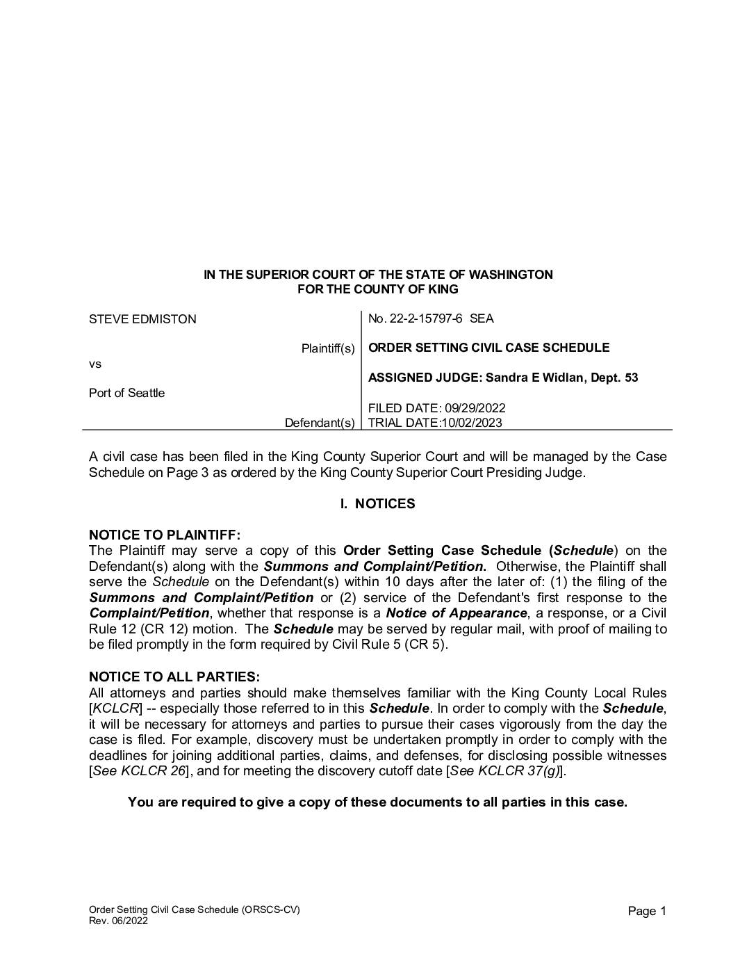 Edmiston v. Port of Seattle – Order Setting Civil Case Schedule, September 29, 2022
