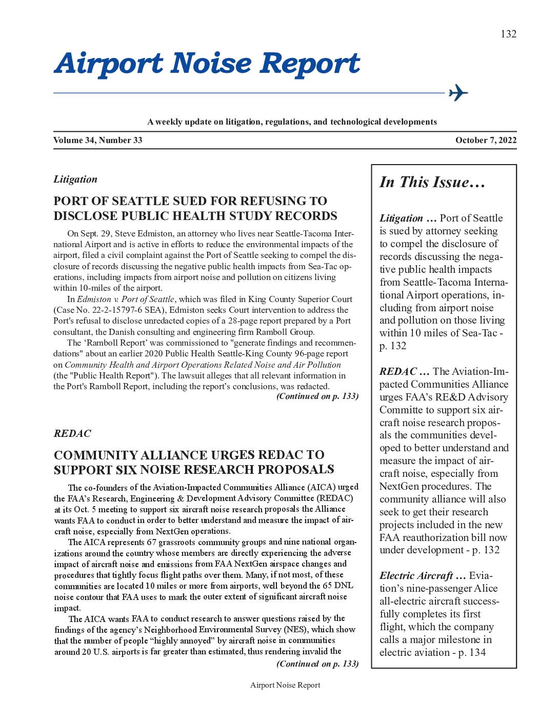 A weekly update on litigation, regulations, and technological developments Volume 34, Number 33 October 7, 2022 In This Issue… Litigation … Port of Seattle is sued by attorney seeking to compel the disclosure of records discussing the nega- tive public health impacts from Seattle-Tacoma Interna- tional Airport operations, in- cluding from airport noise and pollution on those living within 10 miles of Sea-Tac - p. 132 REDAC … The Aviation-Im- pacted Communities Alliance urges FAA’s RE&D Advisory Committe to support six air- craft noise research propos- als the communities devel- oped to better understand and measure the impact of air- craft noise, especially from NextGen procedures. The community alliance will also seek to get their research projects included in the new FAA reauthorization bill now under development - p. 132 Electric Aircraft … Evia- tion’s nine-passenger Alice all-electric aircraft success- fully completes its first flight, which the company calls a major milestone in electric aviation - p. 134 (Continued on p. 133) (Continued on p. 133)