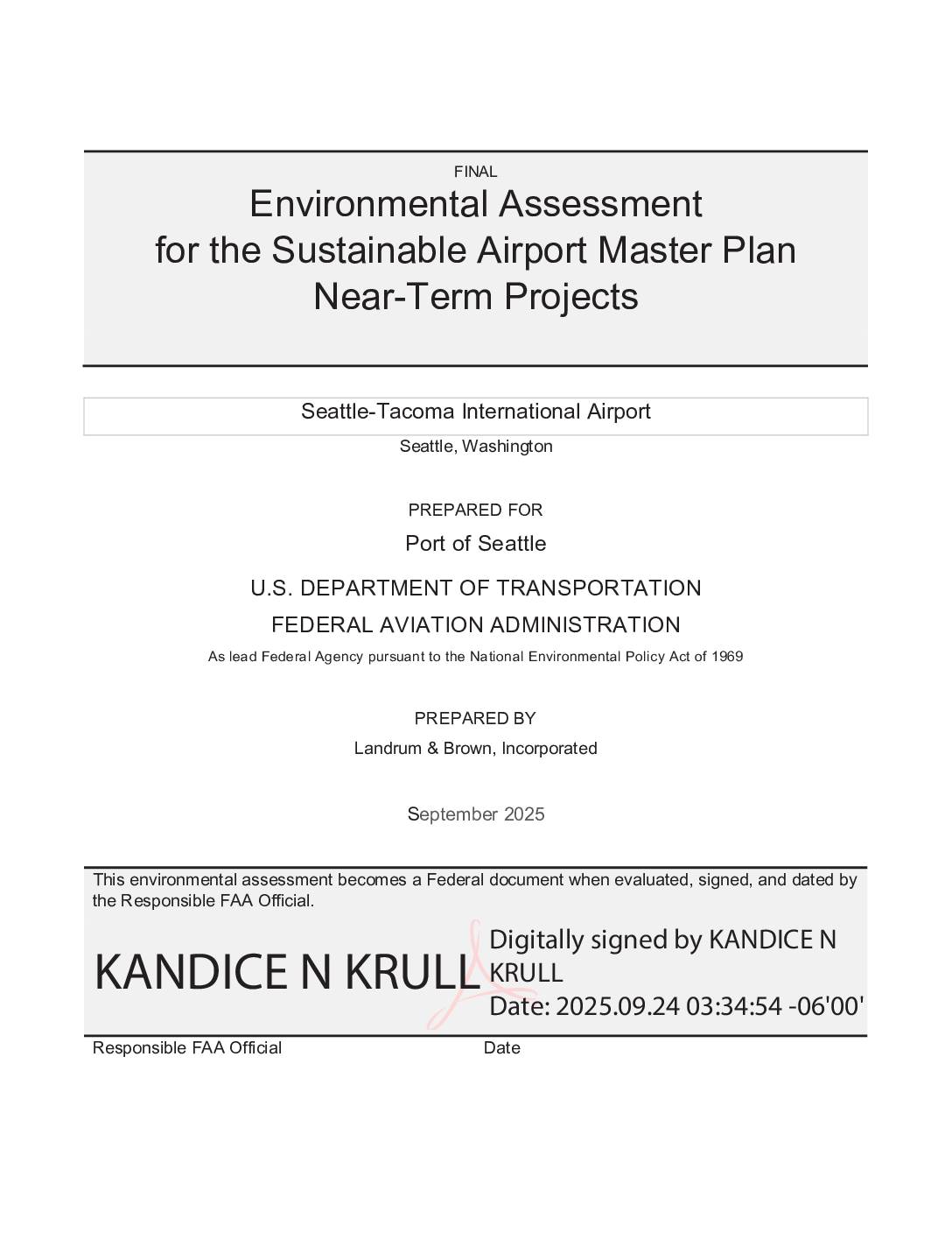 Cover page: Final Environmental Assessment for the Sustainable Airport Master Plan Near-Term Projects, Sea-Tac. Signed by FAA Responsible Official Kandice N. Krull, September 2025.