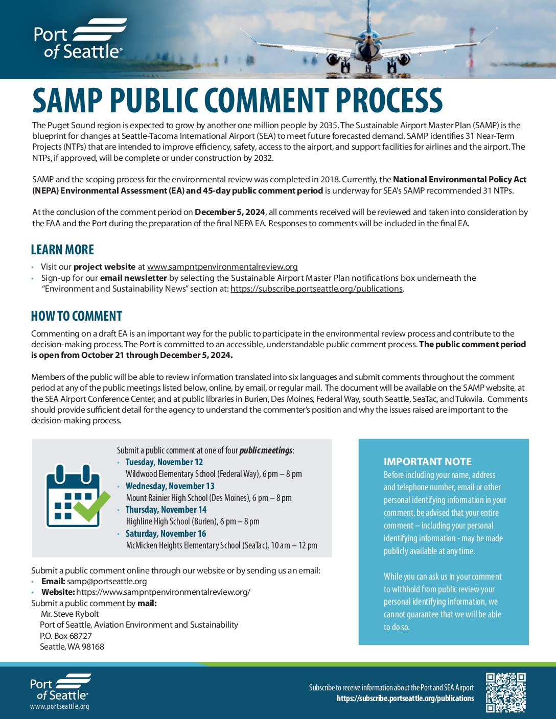 The Puget Sound region is expected to grow by another one million people by 2035. The Sustainable Airport Master Plan (SAMP) is the blueprint for changes at Seattle-Tacoma International Airport (SEA) to meet future forecasted demand. SAMP identi�es 31 Near-Term Projects (NTPs) that are intended to improve e�ciency, safety, access to the airport, and support facilities for airlines and the airport. The NTPs, if approved, will be complete or under construction by 2032. SAMP and the scoping process for the environmental review was completed in 2018. Currently, the National Environmental Policy Act (NEPA) Environmental Assessment (EA) and 45-day public comment period is underway for SEA’s SAMP recommended 31 NTPs. At the conclusion of the comment period on December 5, 2024, all comments received will be reviewed and taken into consideration by the FAA and the Port during the preparation of the �nal NEPA EA. Responses to comments will be included in the �nal EA. Submit a public comment online through our website or by sending us an email: • Email: samp@portseattle.org • Website: https://www.sampntpenvironmentalreview.org/ Submit a public comment by mail: Mr. Steve Rybolt Port of Seattle, Aviation Environment and Sustainability P.O. Box 68727 Seattle, WA 98168 Submit a public comment at one of four public meetings: • Tuesday, November 12 Wildwood Elementary School (Federal Way), 6 pm – 8 pm • Wednesday, November 13 Mount Rainier High School (Des Moines), 6 pm – 8 pm • Thursday, November 14 Highline High School (Burien), 6 pm – 8 pm • Saturday,…