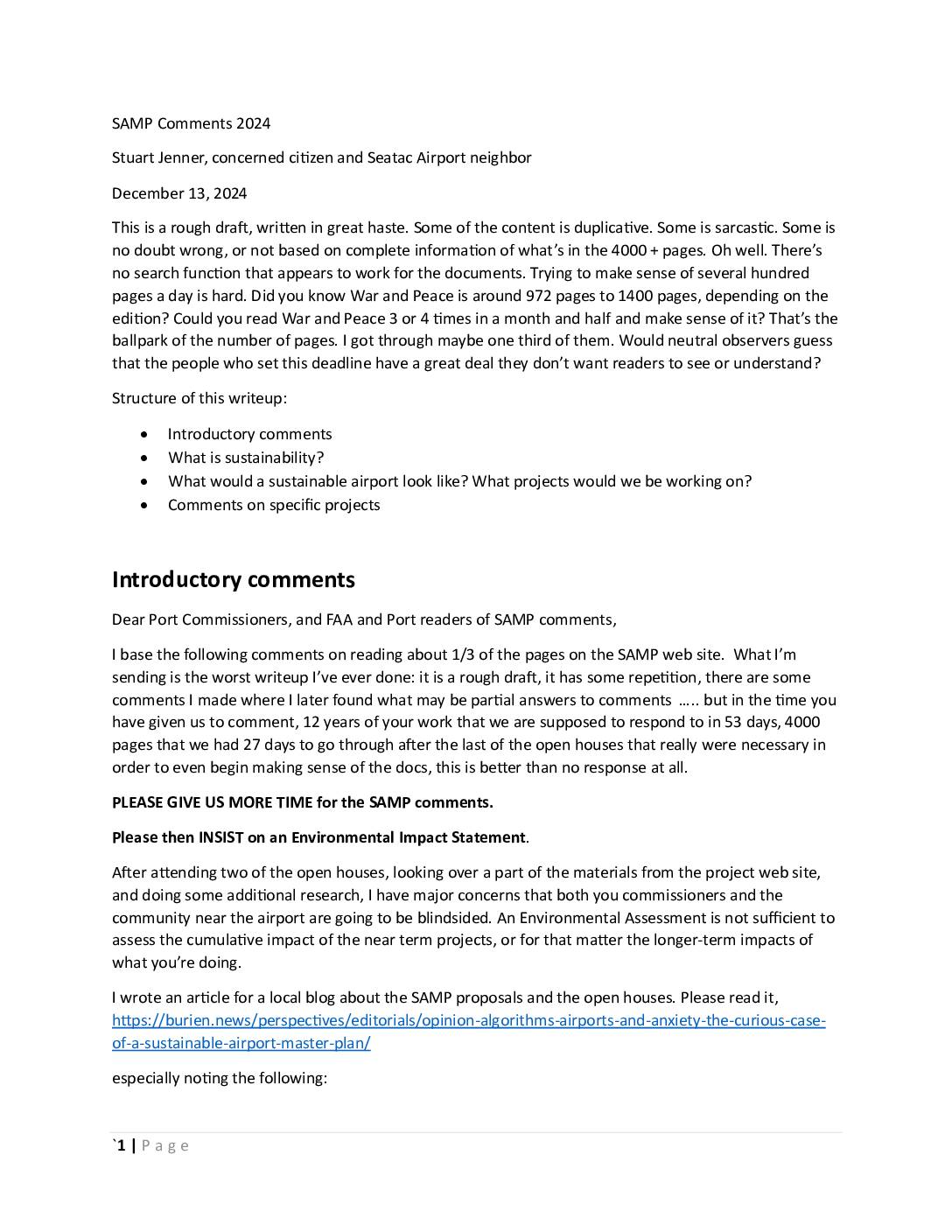 Stuart Jenner, concerned citizen and Seatac Airport neighbor December 13, 2024 This is a rough draft, written in great haste. Some of the content is duplicative. Some is sarcastic. Some is no doubt wrong, or not based on complete information of what’s in the 4000 + pages. Oh well. There’s no search function that appears to work for the documents. Trying to make sense of several hundred pages a day is hard. Did you know War and Peace is around 972 pages to 1400 pages, depending on the edition? Could you read War and Peace 3 or 4 times in a month and half and make sense of it? That’s the ballpark of the number of pages. I got through maybe one third of them. Would neutral observers guess that the people who set this deadline have a great deal they don’t want readers to see or understand? Structure of this writeup: • Introductory comments • What is sustainability? • What would a sustainable airport look like? What projects would we be working on? • Comments on specific projects Introductory comments Dear Port Commissioners, and FAA and Port readers of SAMP comments, base the following comments on reading about 1/3 of the pages on the SAMP web site. What I’m sending is the worst writeup I’ve ever done: it is a rough draft, it has some repetition, there are some comments I made where I later found what may be partial answers to comments ….. but in the time you… -