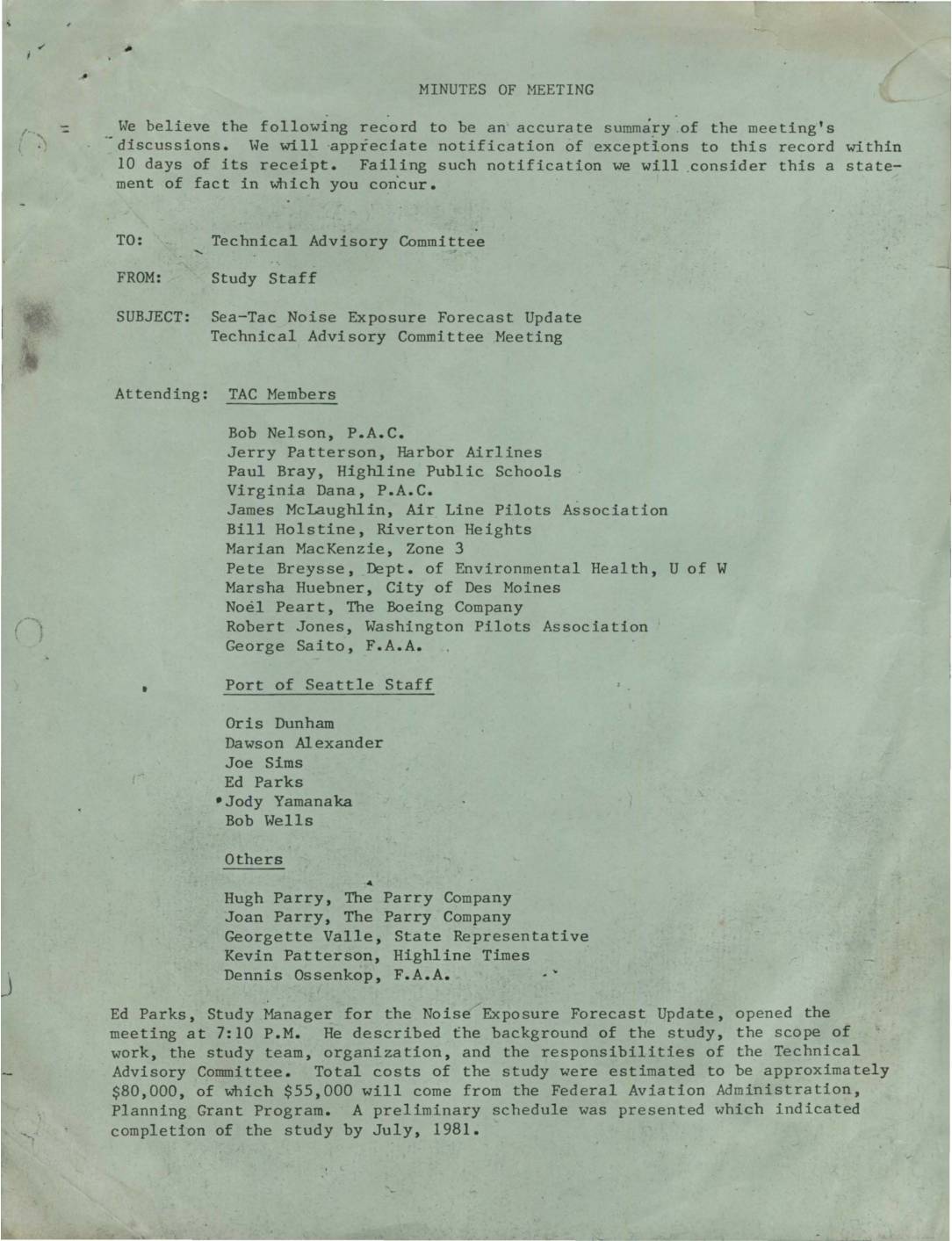 We believe the following record to be an· accurate summary of the meeting's discussions. ole will -appreciate notification of exceptions to this record within days of its receipt. Failing such notification we will consider this a state- ment of fact in which you con'cur. TO: Technical Advisory Committee ..... FROM: Study Staff SUBJECT: Sea-Tac Noise Exposure Forecast Update Technical Advisory Committee Meeting Attending: ,~ TAC Members Bob Nelson, P.A.C. Jerry Patterson, Harbor Airlines Paul Bray, Highline Public Schools Virginia Dana, P.A.C. James McLaughlin, Air Line Pilots Association Bill Holstine, Riverton Heights Marian MacKenzie, Zone 3 Pete Breysse, Dept. of Environmental Health, U of W Marsha Huebner, City of Des Moines Noel Peart, The Boeing Company Robert Jones, Washington Pilots Association George Saito, F.A.A. Port of Seattle Staff Oris Dunham Dawson Alexander Joe Sims Ed Parks •Jody Yamanaka Bob Wells Others ..., ... Hugh Parry, The Parry Company Joan Parry, The Parry Company Georgette Valle, State Representative Kevin Patterson, Highline Times - Dennis Ossenkop, F.A.A. Ed Parks, Study Manager for the Noise / Exposure Forecast Update, opened the meeting at 7:10 P.M. He described the background of the study, the scope of work, the study team, organization, and the responsibilities of the Technical Advisory Committee. Total costs of the study were estimated to be approximately $80,000, of which $55,000 will come from the Federal Aviation Administration, Planning Grant Program. A preliminary schedule was presented which indicated completiun of the study by July, 1981. Study progress was summarized by Jody Yamanaka. The… -