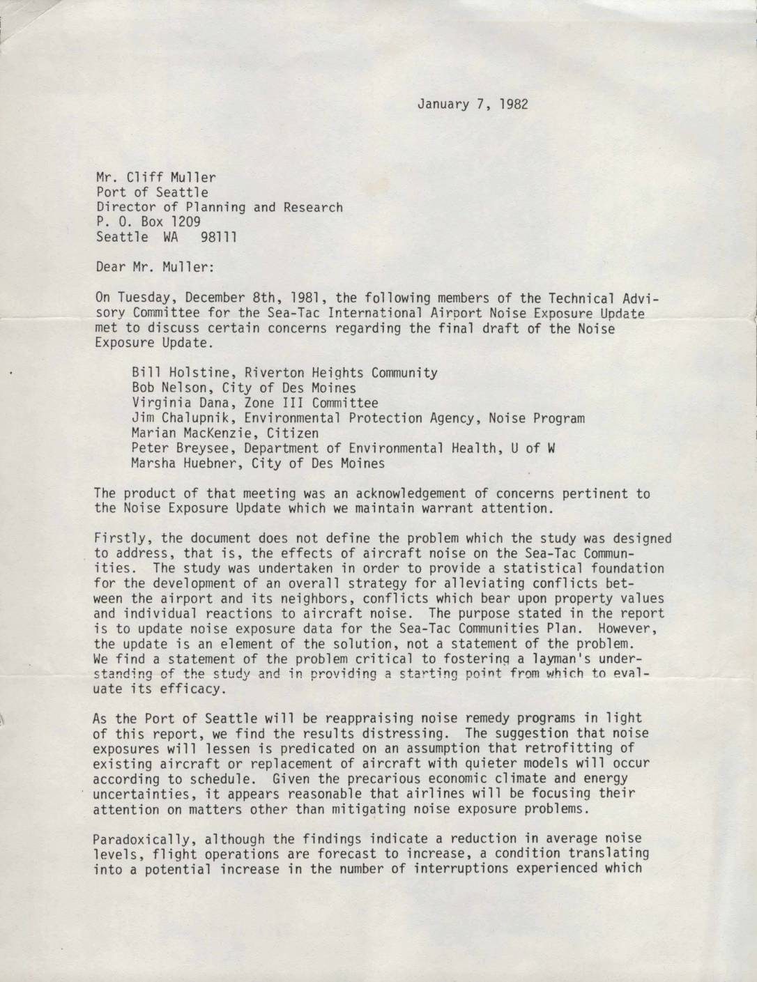 On Tuesday, December 8th the following members of the Technical Advisory Committee for the Sea-Tac International Airport Noise Exposure Update met to discuss certain concerns regarding the final draft of the Noise Expo- sure Update. Bill Holstine, Riverton Heights Community Bob Nelson, City of Des Moines Virginia Dana, Zone III Committee Jim Chalupnik, Environmental Protection Agency, Noise Program Marian McKenzie, Citizen Peter Breysee, Departmentof Environmental Health, U of W Marsha Huebner, City of Des Moines The product of that meeting was an acknolwedgement of concerns pertinent to the Noise Exposure Update which we maintain warrant attention. Firstly, the document does not define the problem which the study was designed to address, that is, the effects of aircraft noise on the Sea- , Tac Commu nities. The study was undertaken ir. order to provide a statis- tical foundation for the development of an overall strategy for alleviating conflicts between the airport and its neighbors, conflicts which bear upon property values and individual reactions to aircraft noise. The purpose stated in the report is to update noise exposure data for the Sea-Tac Communities Plan. However, the update is an element of the solution, not a statement of the problem. We find a statement of the problem illiciting ~ the study critical to fostering a layman's understanding of the noise exposure update and in providing a starting point from which to evaluate its efficacy. As the Port of Seattle will be reappra1s1ng noise remedy programs in light of this report, we find the… -