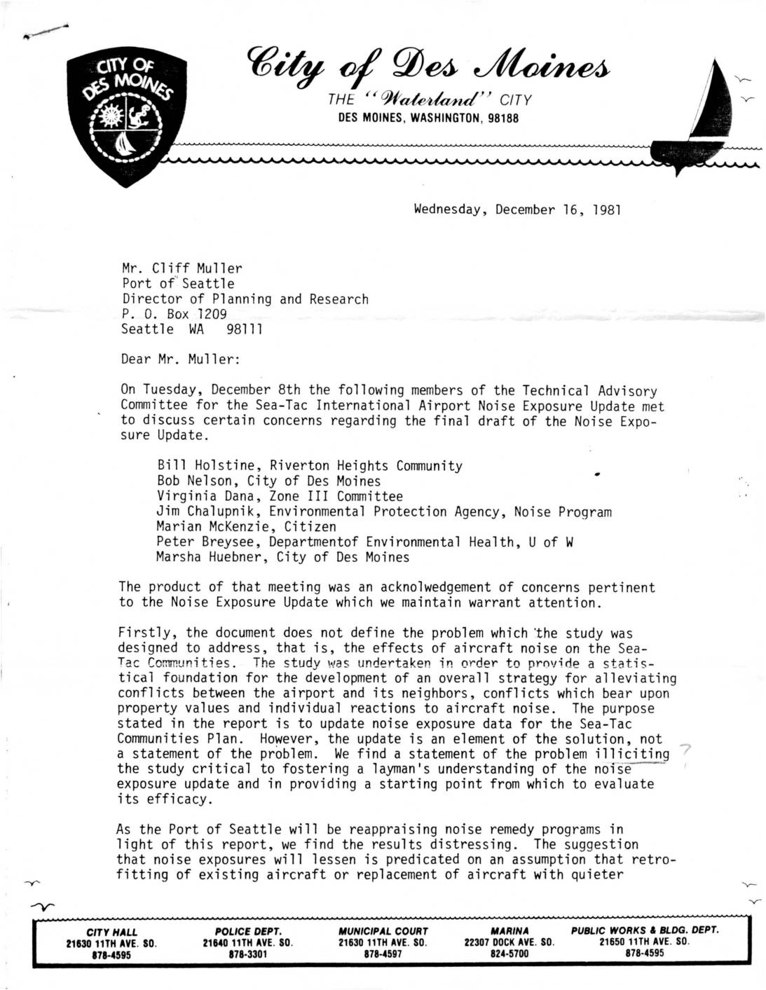 City of Des Moines (TAC) to Cliff Muller re. Noise Exposure Update 12/16/1981