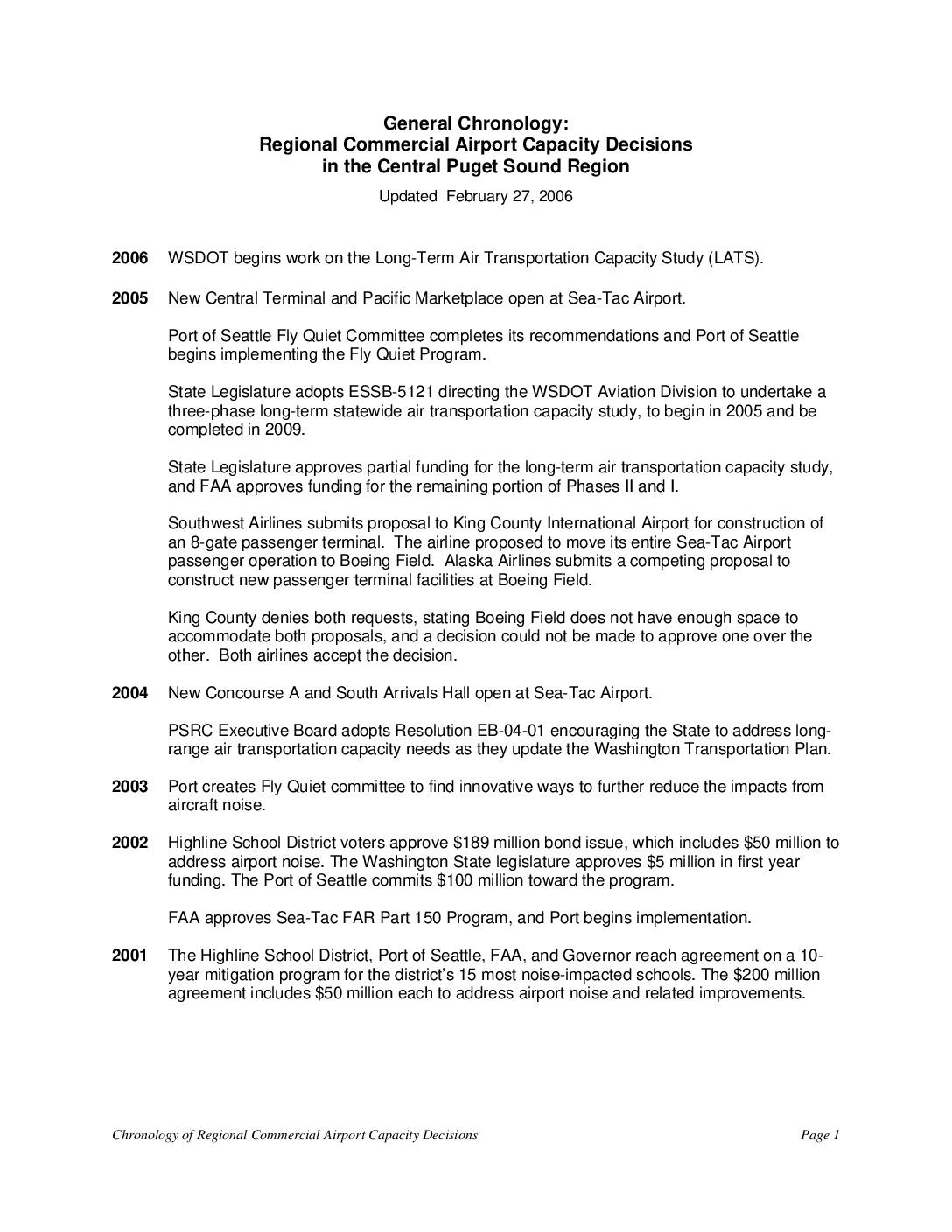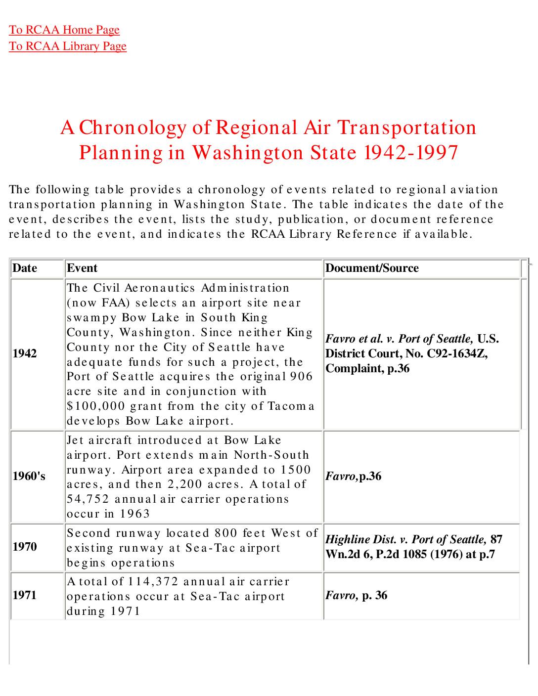 The following table provides a chronology of events related to regional aviation transportation planning in Washington State. The table indicates the date of the event, describes the event, lists the study, publication, or document reference related to the event, and indicates the RCAA Library Reference if available. Date Event Document/Source 1942 The Civil Aeronautics Administration (now FAA) selects an airport site near swampy Bow Lake in South King County, Washington. Since neither King County nor the City of Seattle have adequate funds for such a project, the Port of Seattle acquires the original 906 acre site and in conjunction with $100,000 grant from the city of Tacoma develops Bow Lake airport. Favro et al. v. Port of Seattle, U.S. District Court, No. C92-1634Z, Complaint, p.36 1960's Jet aircraft introduced at Bow Lake airport. Port extends main North-South runway. Airport area expanded to 1500 acres, and then 2,200 acres. A total of 54,752 annual air carrier operations occur in 1963 Favro,p.36 1970 Second runway located 800 feet West of existing runway at Sea-Tac airport begins operations Highline Dist. v. Port of Seattle, 87 Wn.2d 6, P.2d 1085 (1976) at p.7 1971 A total of 114,372 annual air carrier operations occur at Sea-Tac airport during 1971 Favro, p. 36 http://www.rcaanews.org/ http://www.rcaanews.org/water/libr1.htm 6/29/73 Highline School District files suit against Port of Seattle for damages allegedly caused by"noise, vibration, and smoke from aircraft landing and taking off at the airport". Highline at p.8 1973 King County and the Port of Seattle issue the Sea-Tac…