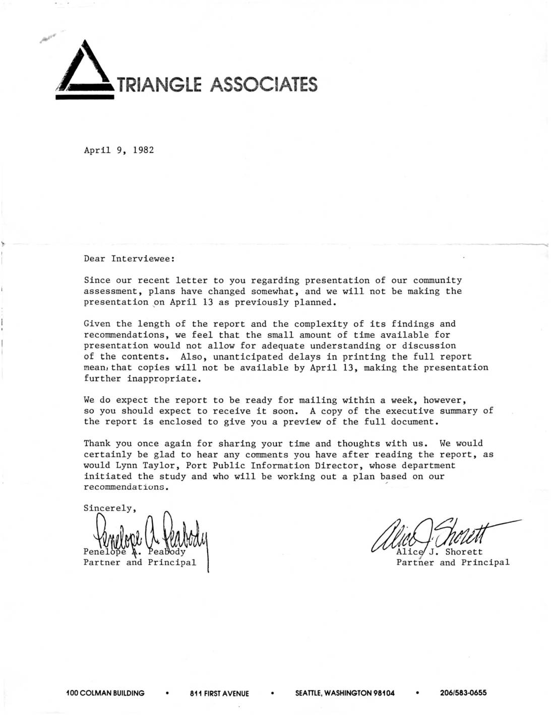 Since our recent letter to you regarding presentation of our community assessment, plans have changed somewhat, and we will not be making the presentation pn April 13 as previously planned. Given the length of the report and the complexity of its findings and recommendations, we feel that the small amount of time available for presentation would not allow for adequate understanding or discussion of the contents. Also, unanticipated delays in printing the full report mean,that copies will not be available by April 13, making the presentation further inappropriate. We do expect the report to be ready for mailing within a week, however, so you should expect to receive it soon. A copy of the executive summary of the report is enclosed to give you a preview of the full document. Thank you once again for sharing your time and thoughts with us. We would certainly be glad to hear any comments you have after reading the report, as would Lynn Taylor, Port Public Information Director, whose department initiated the study and who will be working out a plan based on our recommendations. ~~tQ~~ Partner and Principal 100 COLMAN BUILDING • 811 FIRST AVENUE • SEATTLE, WASHINGTON 98104 • 206/583-0655 ' .. ,......_ .. ~ .. EXECUTIVE SUMMARY A COMMUNITY ASSESSMENT FOR THE PORT OF SEATTLE PREPARED BY: PRINCIPALS: ASSISTANT: Triangle Associates Penelope Peabody Alice Shorett Nancy Harrison ·. ~ ... . • .' ·' EXECUTIVE SUMMARY Triangle Associates was retained by the Port of Seattle to assess the Port•s relationships…