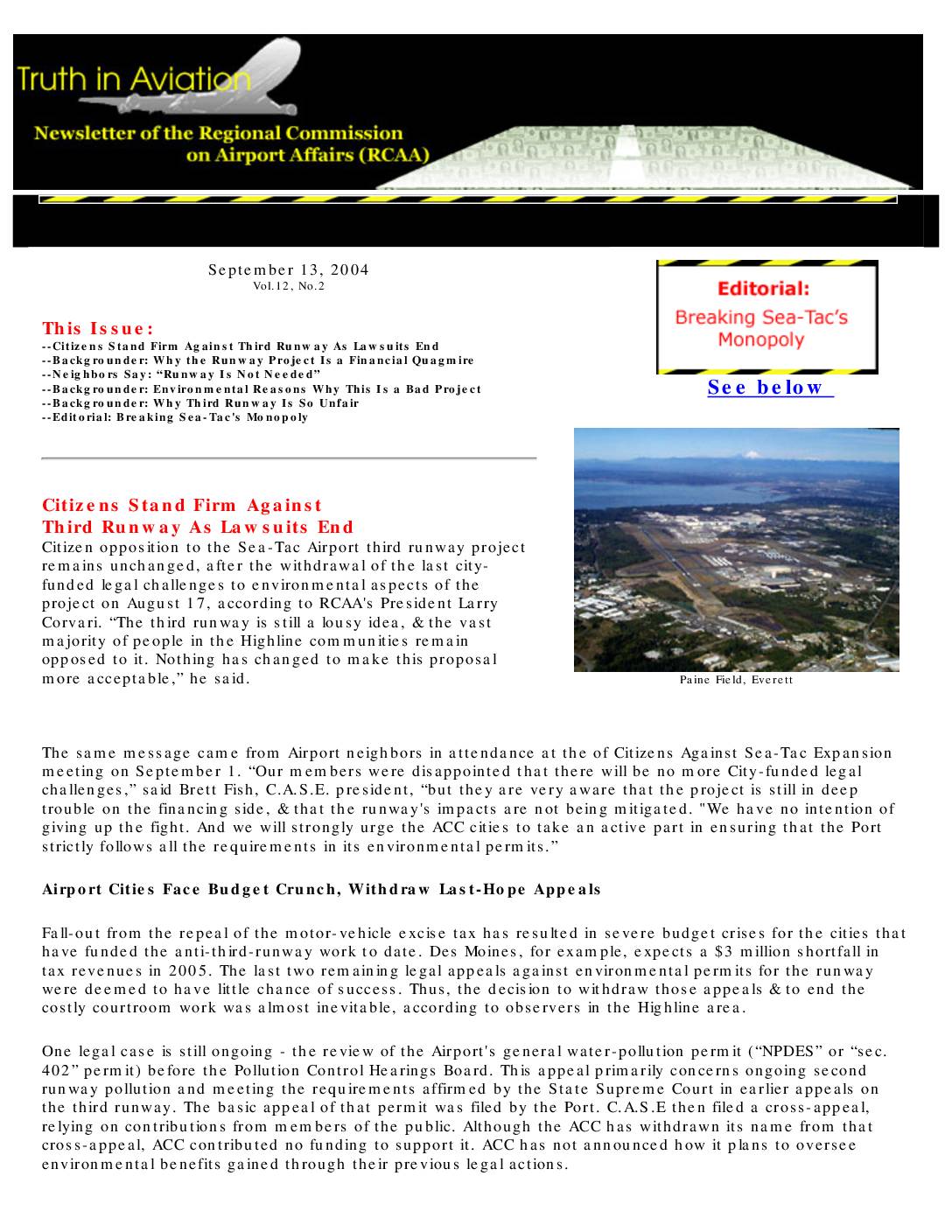 --Citizens Stand Firm Against Third Runway As Lawsuits End --Backgrounder: Why the Runway Project Is a Financial Quagmire --Neighbors Say: “Runway Is Not Needed” --Backgrounder: Environmental Reasons Why This Is a Bad Project --Backgrounder: Why Third Runway Is So Unfair --Editorial: Breaking Sea-Tac's Monopoly Citizens Stand Firm Against Third Runway As Lawsuits End Citizen opposition to the Sea-Tac Airport third runway project remains unchanged, after the withdrawal of the last city- funded legal challenges to environmental aspects of the project on August 17, according to RCAA's President Larry Corvari. “The third runway is still a lousy idea, & the vast majority of people in the Highline communities remain opposed to it. Nothing has changed to make this proposal more acceptable,” he said. See below Paine Field, Everett The same message came from Airport neighbors in attendance at the of Citizens Against Sea-Tac Expansion meeting on September 1. “Our members were disappointed that there will be no more City-funded legal challenges,” said Brett Fish, C.A.S.E. president, “but they are very aware that the project is still in deep trouble on the financing side, & that the runway's impacts are not being mitigated. "We have no intention of giving up the fight. And we will strongly urge the ACC cities to take an active part in ensuring that the Port strictly follows all the requirements in its environmental permits.” Airport Cities Face Budget Crunch, Withdraw Last-Hope Appeals Fall-out from the repeal of the motor-vehicle excise tax has resulted in severe budget crises… -