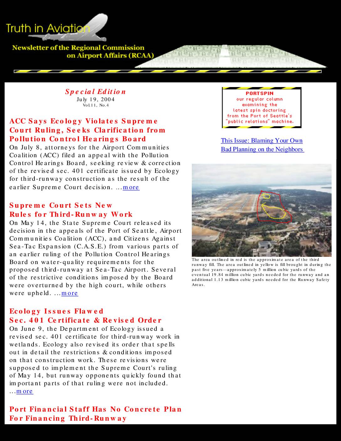 On July 8, attorneys for the Airport Communities Coalition (ACC) filed an appeal with the Pollution Control Hearings Board, seeking review & correction of the revised sec. 401 certificate issued by Ecology for third-runway construction as the result of the earlier Supreme Court decision. ...more Supreme Court Sets New Rules for Third-Runway Work On May 14, the State Supreme Court released its decision in the appeals of the Port of Seattle, Airport Communities Coalition (ACC), and Citizens Against Sea-Tac Expansion (C.A.S.E.) from various parts of an earlier ruling of the Pollution Control Hearings Board on water-quality requirements for the proposed third-runway at Sea-Tac Airport. Several of the restrictive conditions imposed by the Board were overturned by the high court, while others were upheld. ...more Ecology Issues Flawed Sec. 401 Certificate & Revised Order On June 9, the Department of Ecology issued a revised sec. 401 certificate for third-runway work in wetlands. Ecology also revised its order that spells out in detail the restrictions & conditions imposed on that construction work. These revisions were supposed to implement the Supreme Court's ruling of May 14, but runway opponents quickly found that important parts of that ruling were not included. ...more Port Financial Staff Has No Concrete Plan For Financing Third-Runway This Issue: Blaming Your Own Bad Planning on the Neighbors The area outlined in red is the approximate area of the third runway fill. The area outlined in yellow is fill brought in during the past five years—approximately 5 million cubic yards… -