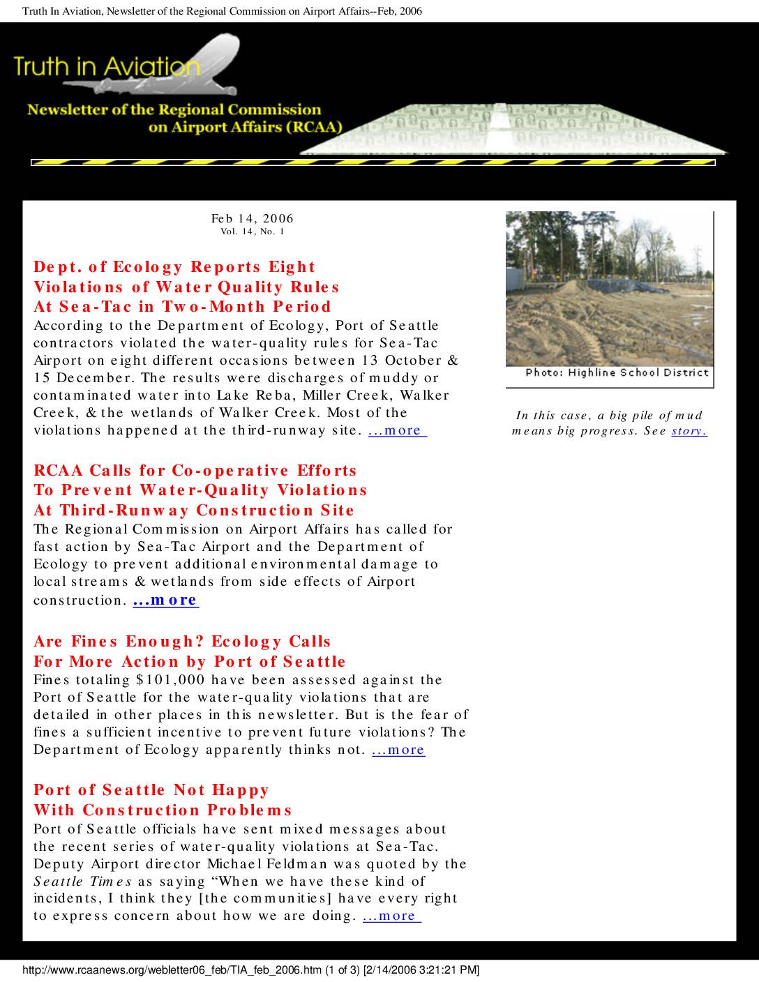 Truth In Aviation, Newsletter of the Regional Commission on Airport Affairs--Feb, 2006 Feb 14, 2006 Vol. 14, No. 1 Dept. of Ecology Reports Eight Violations of Water Quality Rules At Sea-Tac in Two-Month Period According to the Department of Ecology, Port of Seattle contractors violated the water-quality rules for Sea-Tac Airport on eight different occasions between 13 October & December. The results were discharges of muddy or contaminated water into Lake Reba, Miller Creek, Walker Creek, & the wetlands of Walker Creek. Most of the violations happened at the third-runway site. ...more RCAA Calls for Co-operative Efforts To Prevent Water-Quality Violations At Third-Runway Construction Site The Regional Commission on Airport Affairs has called for fast action by Sea-Tac Airport and the Department of Ecology to prevent additional environmental damage to local streams & wetlands from side effects of Airport construction. ...more Are Fines Enough? Ecology Calls For More Action by Port of Seattle Fines totaling $101,000 have been assessed against the Port of Seattle for the water-quality violations that are detailed in other places in this newsletter. But is the fear of fines a sufficient incentive to prevent future violations? The Department of Ecology apparently thinks not. ...more Port of Seattle Not Happy With Construction Problems Port of Seattle officials have sent mixed messages about the recent series of water-quality violations at Sea-Tac. Deputy Airport director Michael Feldman was quoted by the Seattle Times as saying “When we have these kind of incidents, I think they [the communities] have every… -