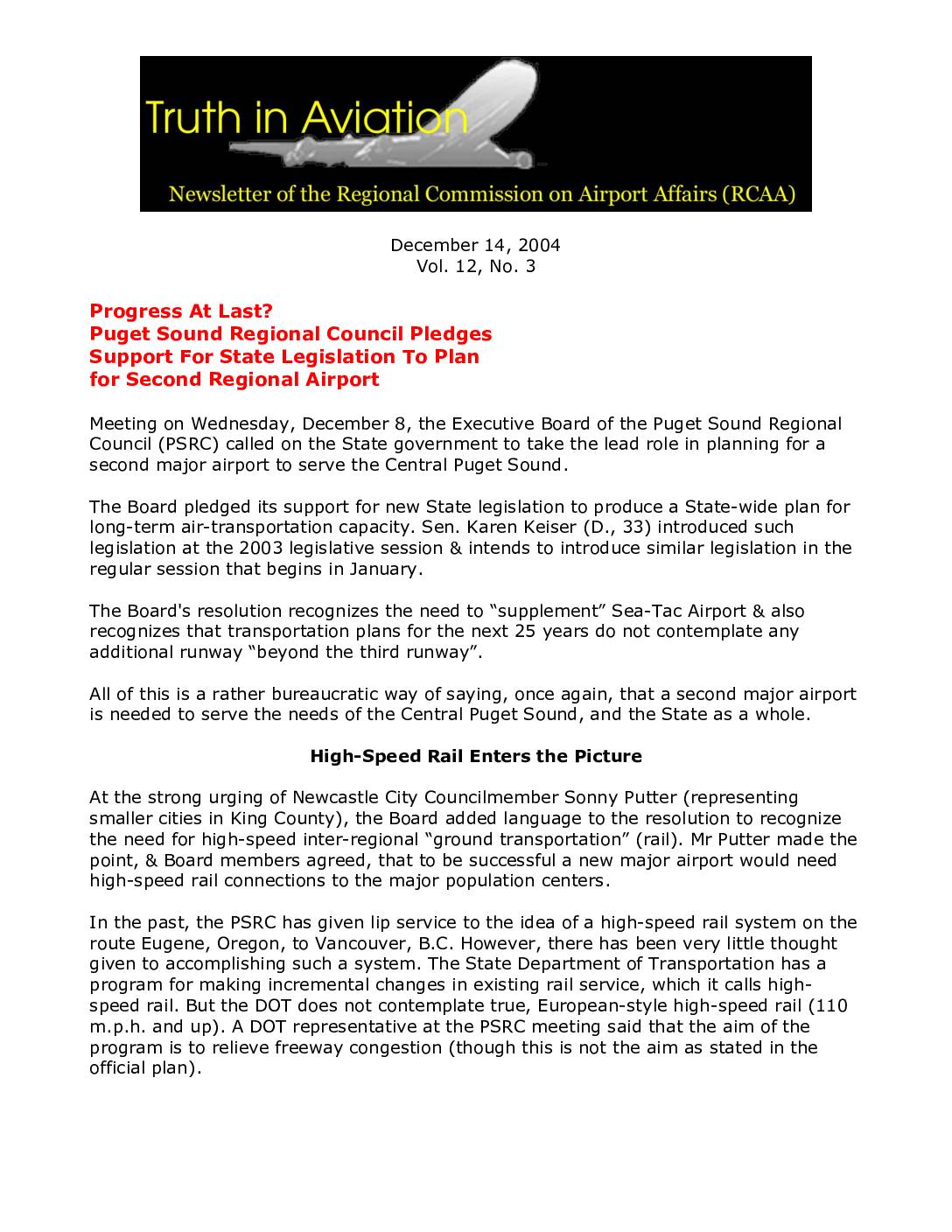 Meeting on Wednesday, December 8, the Executive Board of the Puget Sound Regional Council (PSRC) called on the State government to take the lead role in planning for a second major airport to serve the Central Puget Sound. The Board pledged its support for new State legislation to produce a State-wide plan for long-term air-transportation capacity. Sen. Karen Keiser (D., 33) introduced such legislation at the 2003 legislative session & intends to introduce similar legislation in the regular session that begins in January. The Board's resolution recognizes the need to “supplement” Sea-Tac Airport & also recognizes that transportation plans for the next 25 years do not contemplate any additional runway “beyond the third runway”. All of this is a rather bureaucratic way of saying, once again, that a second major airport is needed to serve the needs of the Central Puget Sound, and the State as a whole. High-Speed Rail Enters the Picture At the strong urging of Newcastle City Councilmember Sonny Putter (representing smaller cities in King County), the Board added language to the resolution to recognize the need for high-speed inter-regional “ground transportation” (rail). Mr Putter made the point, & Board members agreed, that to be successful a new major airport would need high-speed rail connections to the major population centers. In the past, the PSRC has given lip service to the idea of a high-speed rail system on the route Eugene, Oregon, to Vancouver, B.C. However, there has been very little thought given to accomplishing such a… -