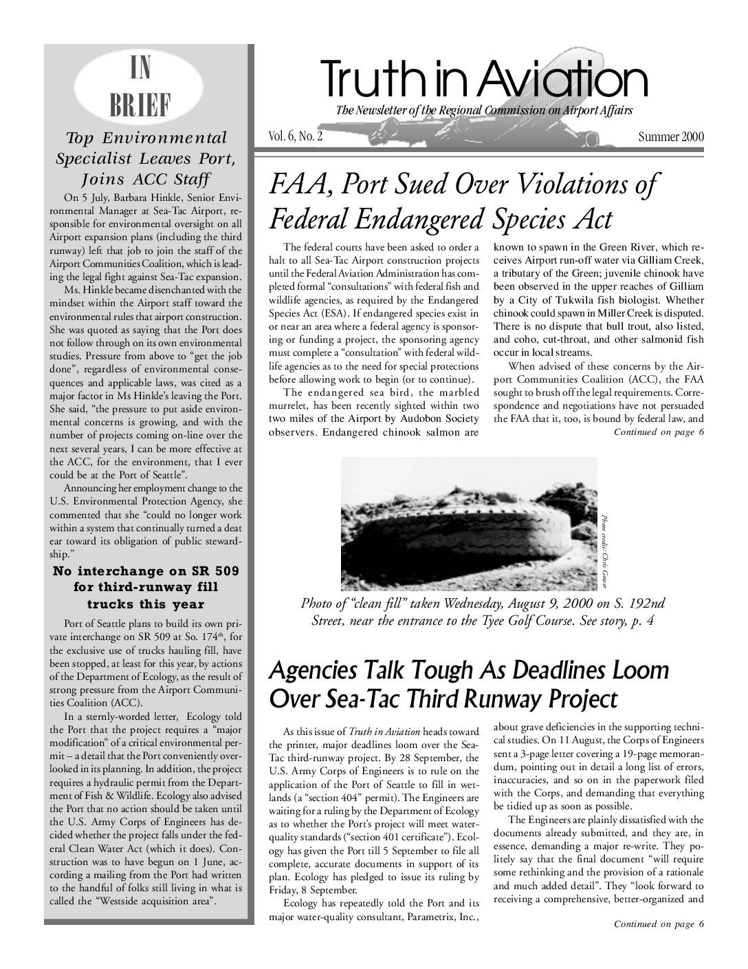 The Newsletter of the Regional Commission on Airport Affairs Photo of “clean fill” taken Wednesday, August 9, 2000 on S. 192nd Street, near the entrance to the Tyee Golf Course. See story, p. 4 Photo credit: C hris G ow er Top Environmental Specialist Leaves Port, Joins ACC Staff On 5 July, Barbara Hinkle, Senior Envi- ronmental Manager at Sea-Tac Airport, re- sponsible for environmental oversight on all Airport expansion plans (including the third runway) left that job to join the staff of the Airport Communities Coalition, which is lead- ing the legal fight against Sea-Tac expansion. Ms. Hinkle became disenchanted with the mindset within the Airport staff toward the environmental rules that airport construction. She was quoted as saying that the Port does not follow through on its own environmental studies. Pressure from above to “get the job done”, regardless of environmental conse- quences and applicable laws, was cited as a major factor in Ms Hinkle’s leaving the Port. She said, “the pressure to put aside environ- mental concerns is growing, and with the number of projects coming on-line over the next several years, I can be more effective at the ACC, for the environment, that I ever could be at the Port of Seattle”. Announcing her employment change to the U.S. Environmental Protection Agency, she commented that she “could no longer work within a system that continually turned a deat ear toward its obligation of public steward- ship.” The federal courts have been asked to order a halt…