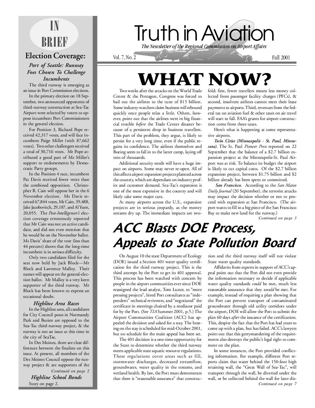 The Newsletter of the Regional Commission on Airport Affairs Vol. 7, No. 2 Fall 2001 IN BRIEF On August 10 the state Department of Ecology (DOE) issued a Section 401 water quality certifi- cation for the third runway project. This is the third attempt by the Port to get its 401 approval. This process has been watched with concern by people in the airport communities ever since DOE reassigned the lead analyst, Tom Luster, to “more pressing projects”, hired Port consultants as “inde- pendent” technical reviewers, and “negotiated” the certificate in meetings chaired by a mediator paid for by the Port. (See TIA Summer 2001, p.5.) The Airport Communities Coalition (ACC) has ap- pealed the decision and asked for a stay. The hear- ing on the stay is scheduled for mid-October 2001, but no schedule for the main appeal has been set. The 401 decision is a one-time opportunity for the State to determine whether the third runway meets applicable state aquatic resource regulations. These regulations cover areas such as fill, stormwater discharges, decreased streamflow, groundwater, water quality in the streams, and wetland health. By law, the Port must demonstrate that there is “reasonable assurance” that construc- tion and the third runway itself will not violate State water quality standards. Affidavits from experts in support of ACC’s ap- peal point out that the Port did not even provide the information necessary to decide if applicable water quality standards could be met, much less reasonable assurance that they would be met.… -