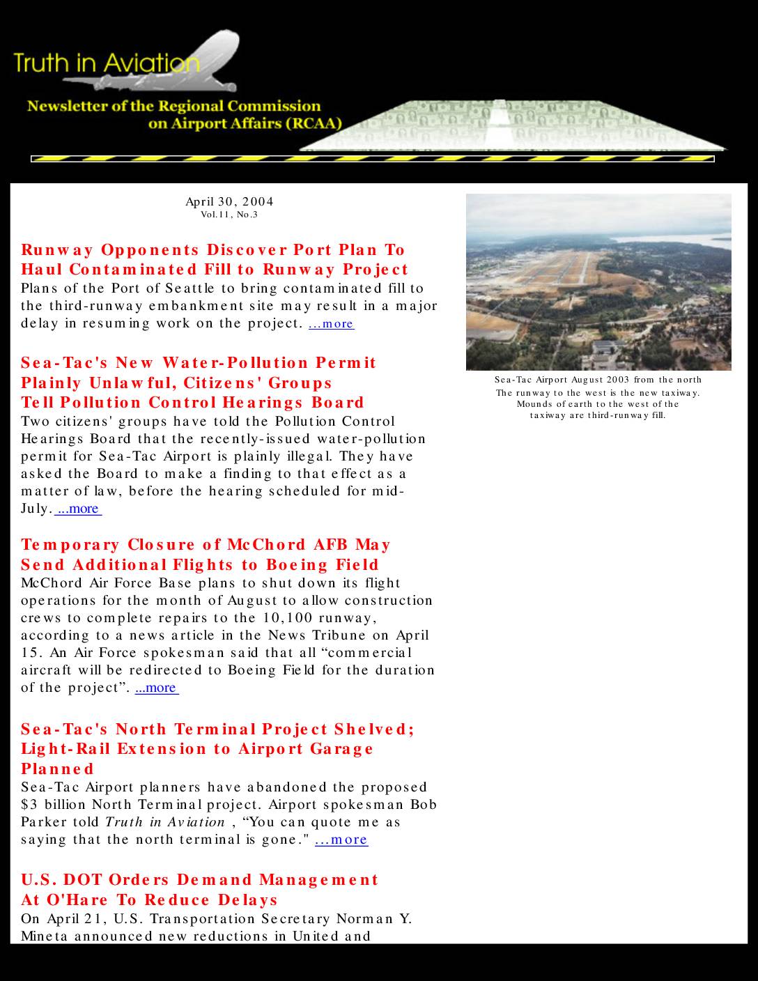 Plans of the Port of Seattle to bring contaminated fill to the third-runway embankment site may result in a major delay in resuming work on the project. ...more Sea-Tac's New Water-Pollution Permit Plainly Unlawful, Citizens' Groups Tell Pollution Control Hearings Board Two citizens' groups have told the Pollution Control Hearings Board that the recently-issued water-pollution permit for Sea-Tac Airport is plainly illegal. They have asked the Board to make a finding to that effect as a matter of law, before the hearing scheduled for mid- July. ...more Temporary Closure of McChord AFB May Send Additional Flights to Boeing Field McChord Air Force Base plans to shut down its flight operations for the month of August to allow construction crews to complete repairs to the 10,100 runway, according to a news article in the News Tribune on April 15. An Air Force spokesman said that all “commercial aircraft will be redirected to Boeing Field for the duration of the project”. ...more Sea-Tac's North Terminal Project Shelved; Light-Rail Extension to Airport Garage Planned Sea-Tac Airport planners have abandoned the proposed $3 billion North Terminal project. Airport spokesman Bob Parker told Truth in Aviation , “You can quote me as saying that the north terminal is gone." ...more U.S. DOT Orders Demand Management At O'Hare To Reduce Delays On April 21, U.S. Transportation Secretary Norman Y. Mineta announced new reductions in United and Sea-Tac Airport August 2003 from the north The runway to the west is the new taxiway. Mounds of earth to… -