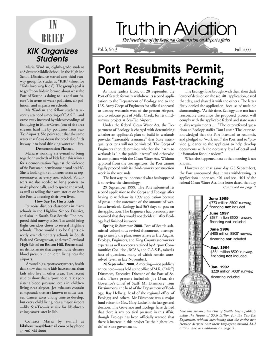 The Newsletter of the Regional Commission on Airport Affairs Vol. 6, No. 4 Spring 2001 IN BRIEF �������� ��� �������� ���� ��� ������������ �� Not once, not twice, but three times, the Port of Seattle, owner-operator of Sea-Tac Airport, has sought official permission to destroy wetlands with its third-runway construction project west of the existing airport. And three times the community has turned out in great strength to tell the regulat- ing agencies that this is a bad idea—bad for the environment, bad for people—and wasteful. Each of the first two applications had to be withdrawn, re-written, and resubmitted, because of fatal flaws. On 26 and 27 January, the Army Corps of Engineers and the Department of Ecology held hearings on the latest proposal submitted by the Port. Hundreds of residents in attendance heard nearly one hundred speakers tell the agencies about their concerns with the proposal. Most of the 117 speakers were in opposition, citing numerous is- sues—airport safety, damage to local streams, con- cerns with the environmental mitigation plans, lack of community mitigation, and, over and over again, the problems posed by the four vertical embank- ment walls. —Against— In their five-minute comments, a stream of residents and local elected officials carried a few basic messages to the two regulatory agencies. * The environmental planning is questionable and incomplete in many details, especially as to ���������� ��� ��� ���� ���� ������� �� ���� �� �������� �� �� �������� ������ ���� ��� ��� ��� ���� ��� �� �������� �… -