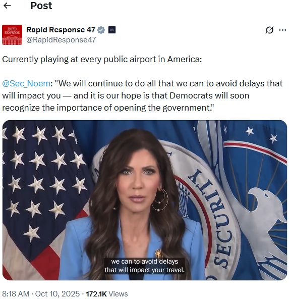 Rapid Response 47 @RapidResponse47 Currently playing at every public airport in America: @Sec_Noem : “We will continue to do all that we can to avoid delays that will impact you — and it is our hope is that Democrats will soon recognize the importance of opening the government.” 8:18 AM · Oct 10, 2025 · -