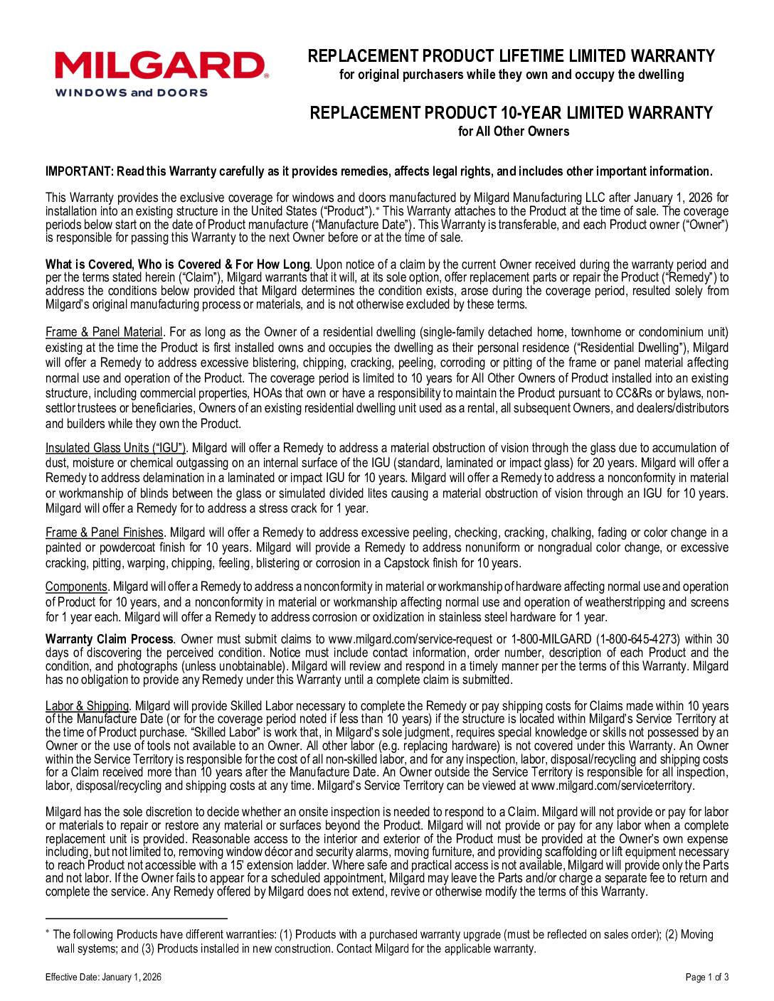 Milgard Manufacturing LLC warranty document for windows and doors manufactured after January 1, 2026 for installation into existing structures. Provides lifetime coverage for original purchasers while they own and occupy their residential dwelling, and 10-year limited warranty for all other owners.