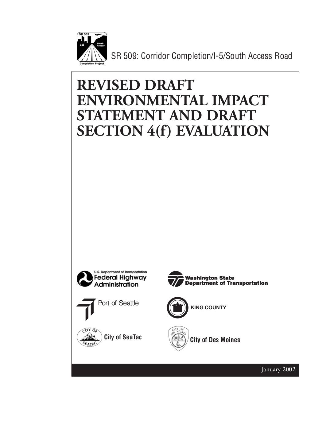 City of SeaTac City of Des Moines ��������� FHW A-W A-RDEIS-95-2 SR 509: Corridor Completion/1-5/South Access Road King County, SeaTac, Des Moines, Kent, and Federal Way, Washington NEPA/SEPA Revised Draft Environmental Impact Statement and Draft Section 4(0 Evaluation Submitted Pursuant to 42 USC 4332(2)(c), 23 USC 138, and 49 USC 303, and RCW 43.21C, WAC 197- and WAC 468-12. by the U.S. Department of Transportation, Federal Highway Administration (FHW A); the Washington State Department of Transportation (WSDOT); the Port of Seattle, King County, City of SeaTac, and City of Des Moines in cooperation with: SR 509/South Access Road Executive Committee This action complies with Executive Order 11990, Protection of Wetlands; and Executive Order 12898, Environmental Justice in Minority and Low.-Income Populations. ttls-!o '- ~te of Approval /~ /o~ ~a. ... c..~ Date of Approval StePbeJlB tler, Dir. of Planning, J~ · ~oirJCdJdYj Date of~ Paul Toliver, Dir. of Transportation, Kin unty Date of Approval s may be contacted for additional information concerning t is document: Jim Leonard Urban Transportation and Environmental Engineer Federal Highway Administration 711 South Capitol Way, Suite 501 Olympia, Washington 98501 Telephone (360) 753-9480 Jerry Alb Director of Environmental Services W A State Dept of Transportation 310 Maple Park A venue SE P.O. Box 47331 Olympia, Washington 98504-7331 Telephone (360) 705-7480 The Federal Highway Administration, the Washington State Department of Transportation, the Port of Seattle, King County, and the Cities of Des Moines and SeaTac propose to improve regional highway connections with an extension of SR 509…