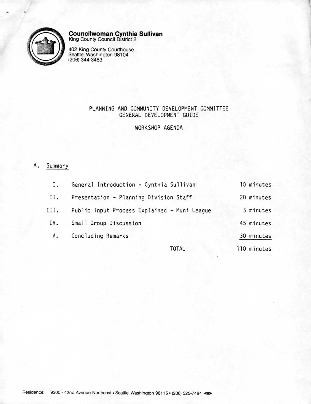 Public Input Process Explained - Muni League Small Group Discussion Concluding Remarks TOTAL Residence: 9300- 42nd Avenue Northeast • Seattle, Washington 98115 • (206) 525-7484 ~ minutes mi!1utes minutes minutes minutes 110 minutes 1. GENERAL DEVELOPMENT GUIDE PRELIMINARY WORKSHOP AGENDA I. General Introduction - Planning & Community Development Corrmittee Chair A. Welcome B. Introduction of convener/moderator, P&CD Committee members, Planning and Council staff, and local officials C. Purpose of meeting D. Review overall s~hedule for Council review of the Guide E. General pro~ess this meeting will follow F. Role of Mu~i ~eague G. Identify location of ir1formation room H. Focus of this particular meeting I. Introduction of Planning Division staff who will provide a general informational briefing II. Presentation - Planning Division staff A. Overvi2w of Guide 8. Focus of the predetermined topics C. Reht~cnship to community plan D. Intoduce Muni League moderator 4023A/KU:at/ 5-11-84 pg 2 III. Public input process explained - Muni League A. Group discussions led by a convener B. Reporting results of group discussions C. Final comments by public IV. Small Group Discussions A. Muni League as moderators (County staff to supplement, if necessary) B. Introduction of participants ,.. .... Question: 11 What are your concerns about your community that the Co~ncil should be aware of?" D. Informal discussions and comments V. Concluding remarks A. Report back on small group discussions - Citizens selected from small grouos B. Final public comment (2 min. per speaker) C. Conclusions - Cynthia Sullivan 4023A/KU:at/5-11-84 pg 3 Councilwoman Cynthia Sullivan… -