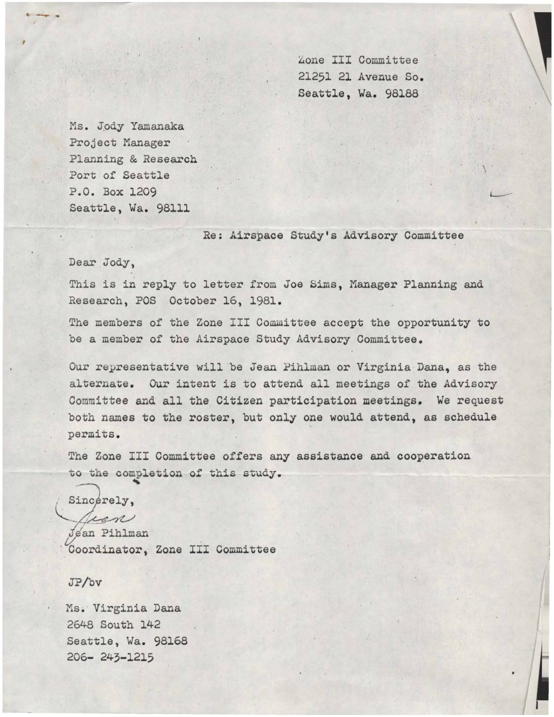Letter from Jean Pihlman, Coordinator of Zone III Committee, accepting invitation to participate in the Port of Seattle’s Airspace Study Advisory Committee. The committee designates Jean Pihlman as representative and Virginia Dana as alternate, offering cooperation for the study completion. -
