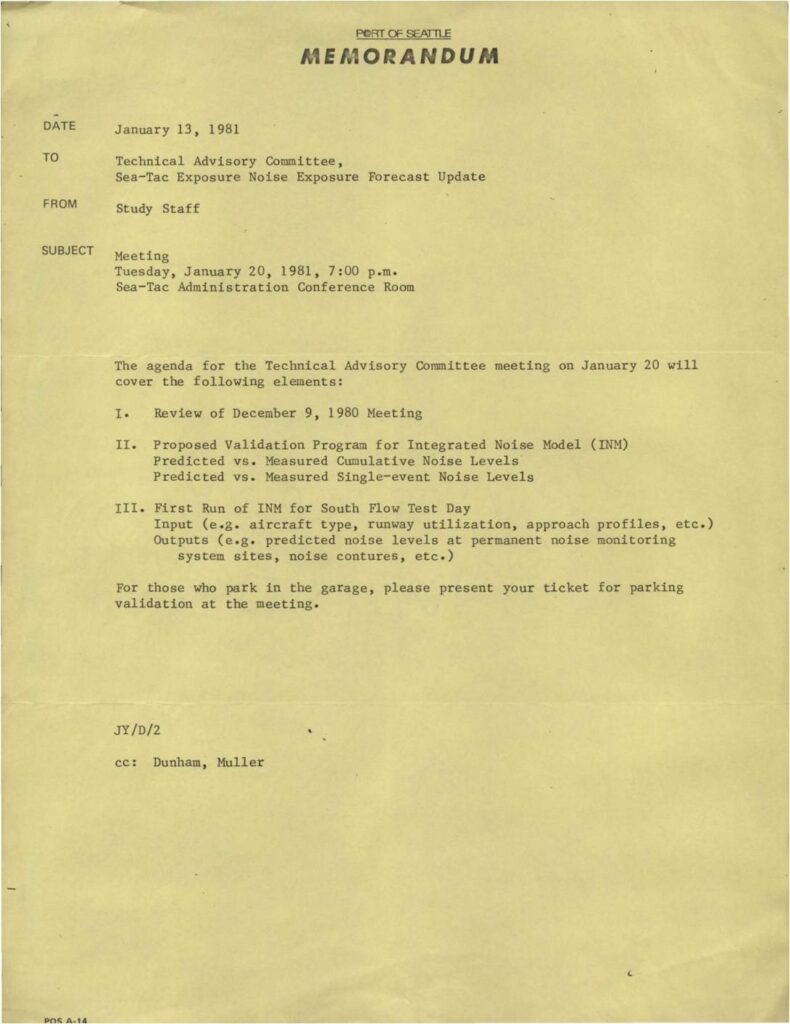 Memorandum from Port of Seattle Study Staff announcing a Technical Advisory Committee meeting for January 20, 1981 to discuss the Sea-Tac noise exposure forecast update. The agenda includes reviewing the previous meeting, proposed validation program for the Integrated Noise Model (INM), and first run of INM for South Flow Test Day.
