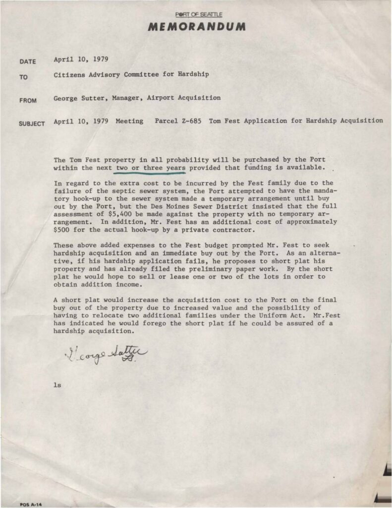 Memorandum from George Sutter regarding Tom Fest’s hardship acquisition application for property that will likely be purchased by the Port within 2-3 years. The Fest family faces additional costs of $5,400 for mandatory sewer hook-up plus $500 for contractor fees, prompting the hardship request.
