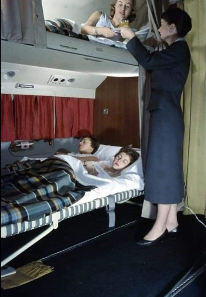 Historical photograph showing airline sleeping berths with passengers resting in bunk-style beds while a flight attendant provides service. This appears to be from an era when airlines offered overnight sleeper accommodations on long-haul flights.