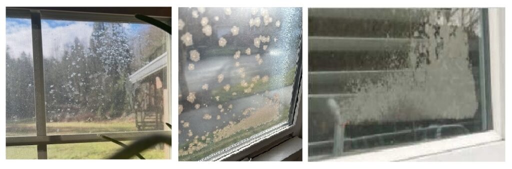 Three images showing window condensation and moisture problems, including water droplets on glass surfaces and what appears to be mold or moisture damage on window frames and glass panels.