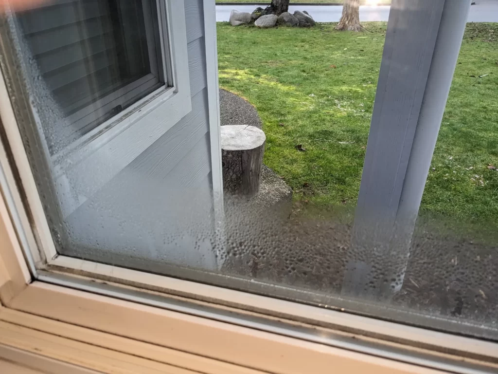 Image showing a view through a window with condensation on the glass, looking out at a green lawn area with a cut tree stump and landscaping. The photo appears to be taken from inside a building looking outward.